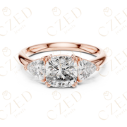 This elegant three stone ring showcases a beautifully balanced design centered around a cushion cut diamond, flanked by two perfectly matched trillion cut side stones. The symmetrical layout enhances visual depth while maximizing brilliance from every angle. A refined prong setting elevates each diamond, allowing light to flow freely through the stones for exceptional sparkle and presence.