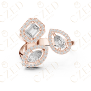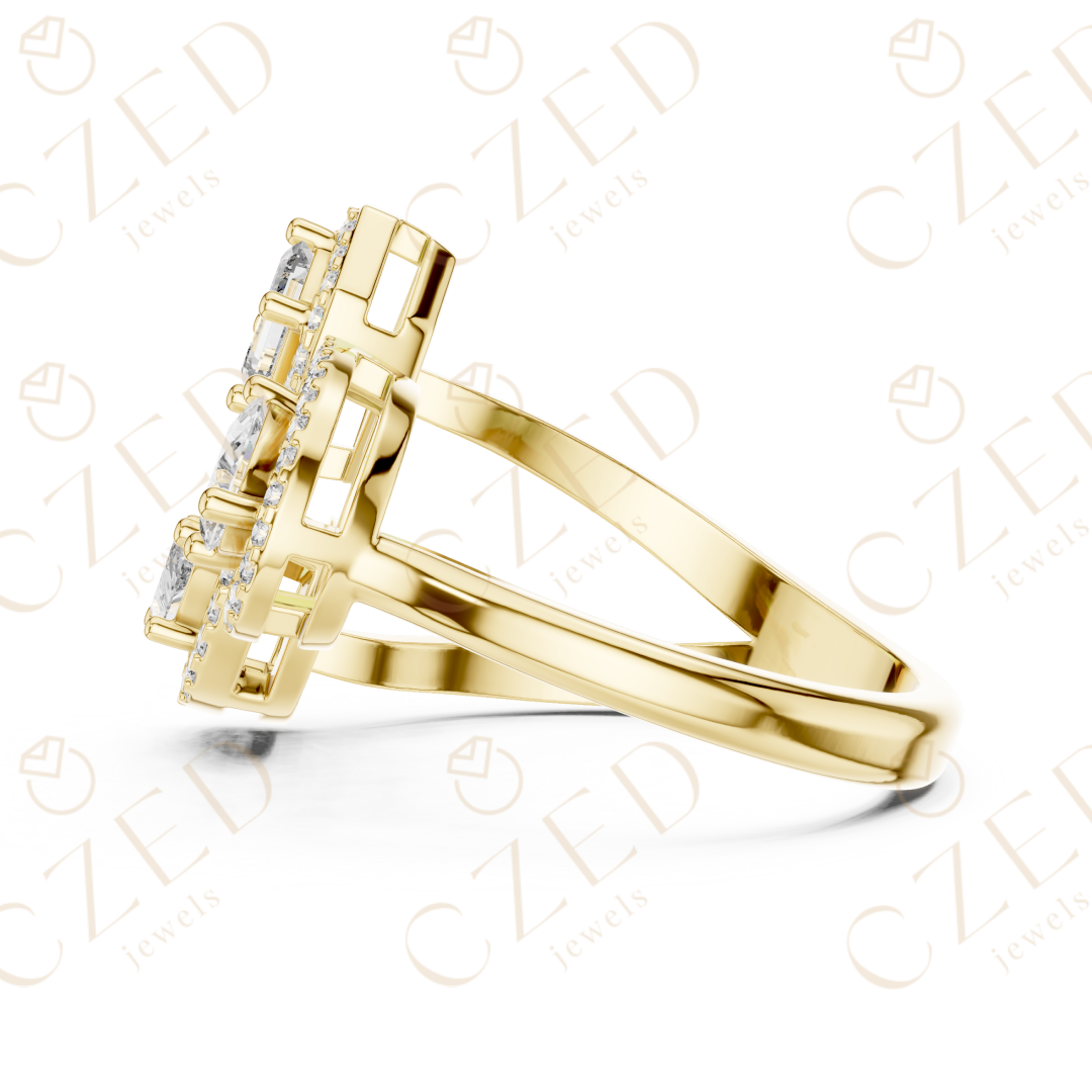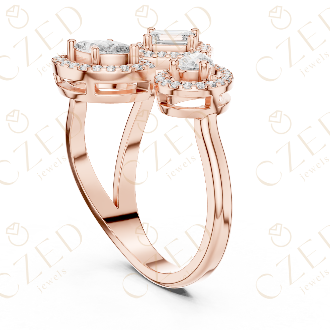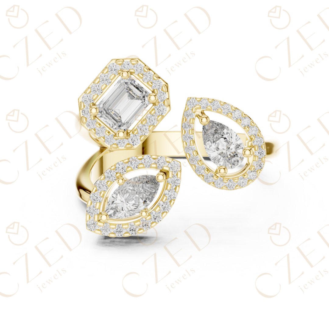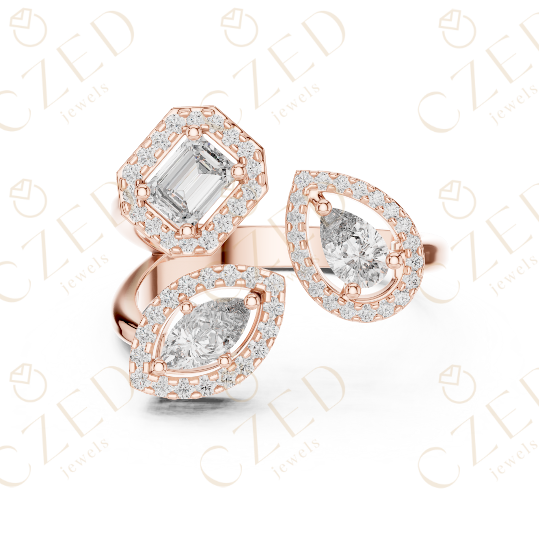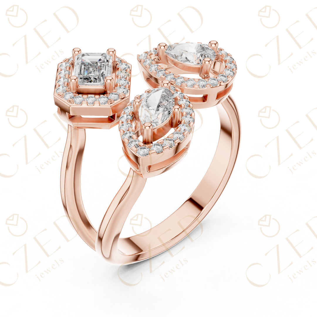 This refined diamond ring showcases a striking three-stone composition featuring emerald, marquise, and pear cut diamonds. Each stone is framed by a delicate halo, creating visual depth, enhanced brilliance, and elegant symmetry. The balanced arrangement highlights distinct diamond shapes while maintaining a cohesive, luxurious aesthetic designed to captivate from every angle.