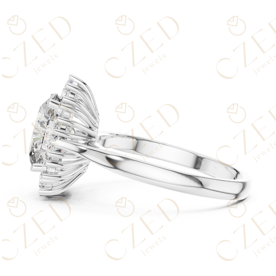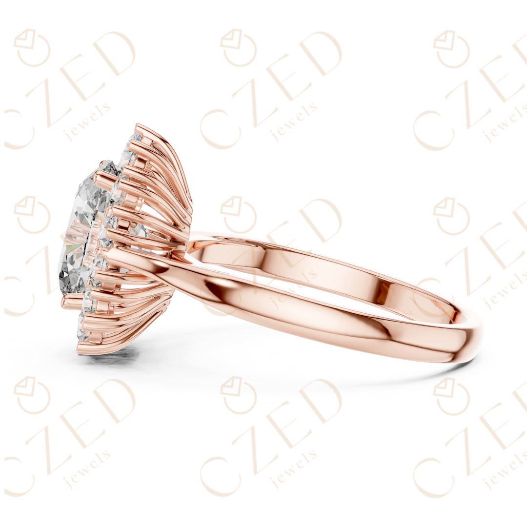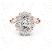 - Diamond Shape & Cut: Oval Brilliant (center), Round Brilliant (halo)