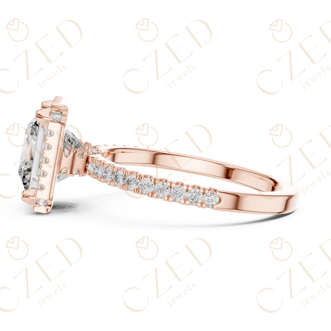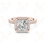 This refined engagement ring features a captivating princess cut diamond at its center, framed by a perfectly proportioned halo of round diamonds. The symmetrical layout is enhanced by a pavé-set band that adds depth, brilliance, and a seamless flow of light. Clean lines and balanced proportions create a timeless design with exceptional sparkle from every angle.
