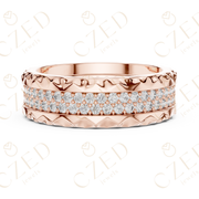 This refined diamond band showcases a continuous row of round brilliant cut diamonds set across the center of the ring, creating a balanced and radiant profile. The diamonds are framed by a distinctive textured edge design that adds visual depth and artisanal character. Its symmetrical construction and uniform stone placement deliver consistent brilliance and a sophisticated, modern aesthetic.