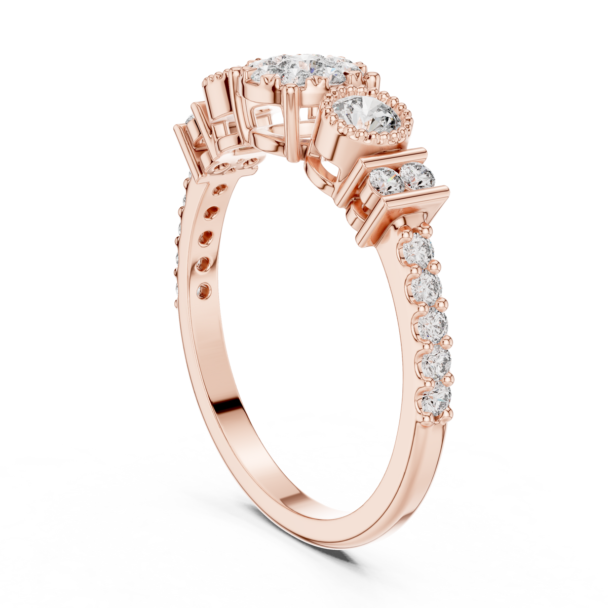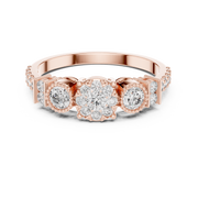 Round Cut Diamond Three Stone Halo Ring with Pavé Set Side Accents