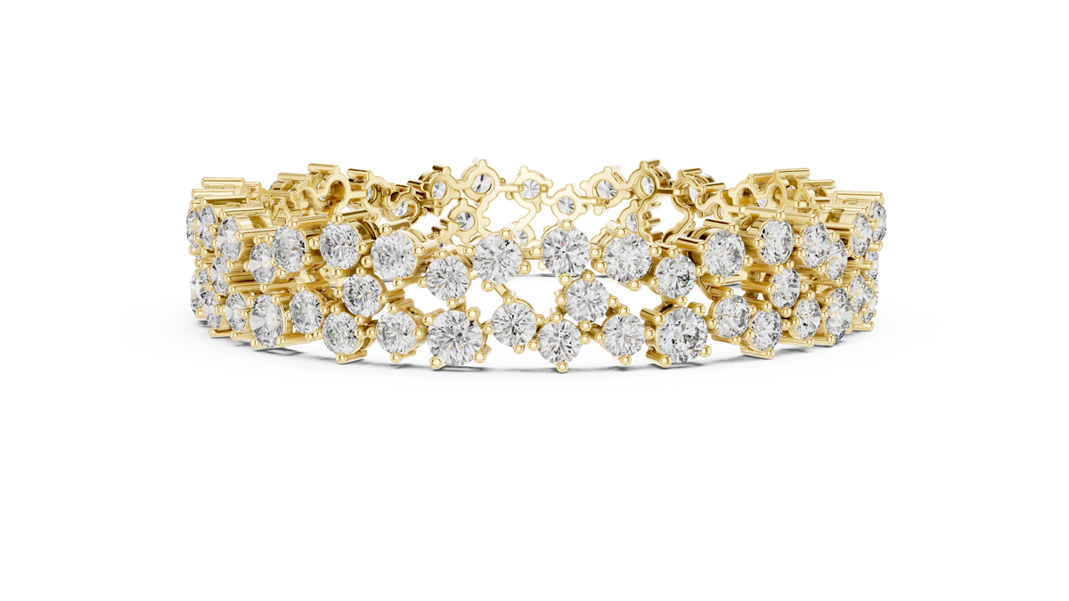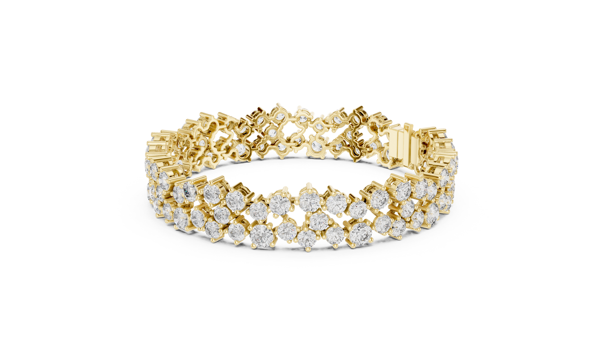 This striking tennis chain bracelet features two rows of round cut diamonds arranged in an elegant cluster formation, creating a fuller and more dimensional look across the wrist. The layered design enhances sparkle and visual depth while maintaining a smooth, flexible silhouette. Each diamond is secured in precise collet settings that maximize light reflection and provide a refined, structured finish. The result is a bold yet timeless bracelet that delivers exceptional brilliance and luxurious presence.