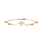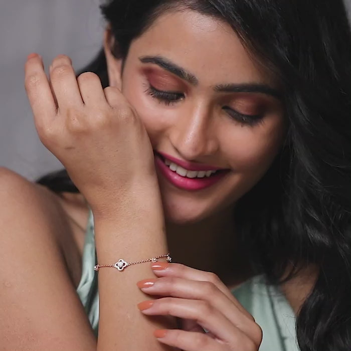 The Flaviana Clover Diamond Bracelet in rose gold features a charming clover motif, symbolizing luck and prosperity. Adorned with diamonds, this piece is a blend of tradition and modern elegance, offering a token of good fortune with a stylish twist. Its delicate design makes it an ideal accessory for daily sophistication or adding a sparkle to evening wear, perfect for those who appreciate symbols of luck crafted with an elegant aesthetic.