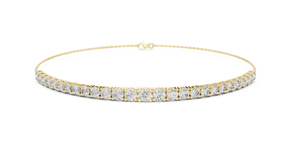 This elegant tennis-style chain bracelet features a continuous line of round cut diamonds that gradually increase in size toward the center, creating a refined graduated silhouette. Each stone is secured in a classic prong setting and connected by flexible links that allow the bracelet to drape naturally across the wrist. The balanced symmetry and fluid structure enhance light performance, delivering exceptional brilliance, depth, and a smooth polished finish.