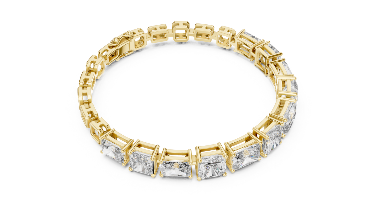 This sophisticated tennis-style bracelet showcases a striking combination of radiant and emerald cut diamonds arranged in a bold, linear sequence. Each stone is individually set within structured link frames, creating a balanced rhythm of clean geometry and fluid movement. The alternating diamond shapes add visual depth and brilliance, while the articulated chain design ensures a graceful fit around the wrist.