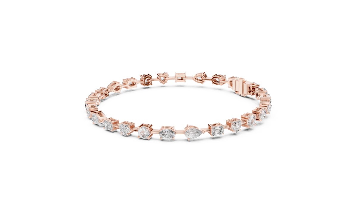 This elegant tennis chain bracelet features a seamless row of mixed-cut diamonds arranged in a balanced, flowing design that wraps the wrist with continuous brilliance. Round, heart, emerald, oval, and pear shaped stones alternate in a rhythmic sequence, creating dimension, sparkle, and visual interest from every angle. Each diamond is secured in refined collet settings that enhance light exposure while maintaining a smooth, polished profile for comfortable daily wear. The overall silhouette is timeless yet distinctive, combining classic tennis styling with modern artistry.