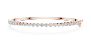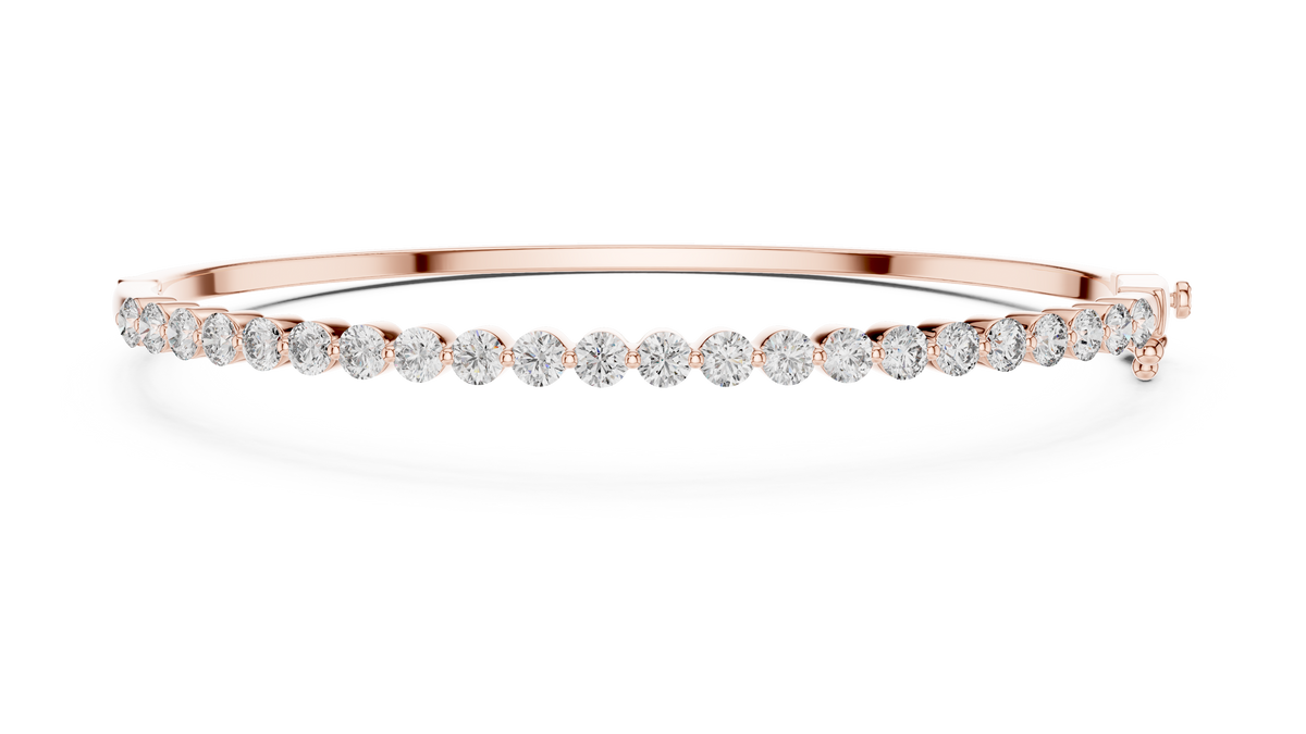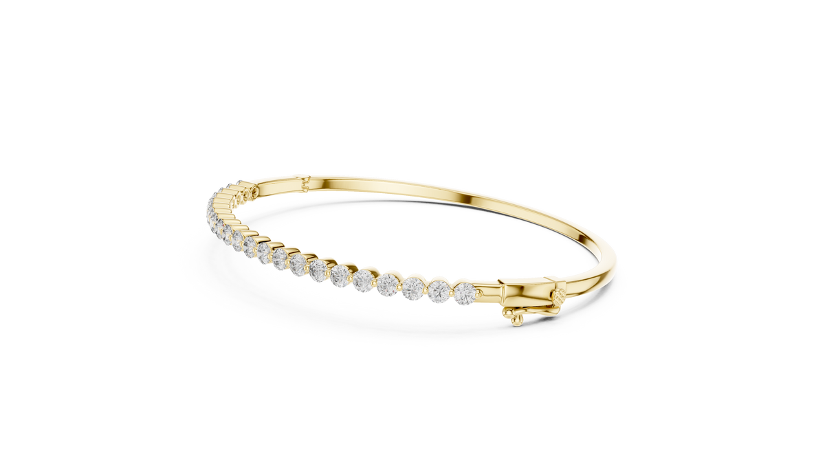 This refined half tennis bangle bracelet features a graceful arc of round cut diamonds set along the top surface of a sleek, polished bangle. The clean, continuous row of stones creates a balanced silhouette that highlights symmetry and light flow across the wrist. With its smooth interior and structured profile, the design offers a modern yet timeless look, delivering brilliant sparkle with elegant minimalism.