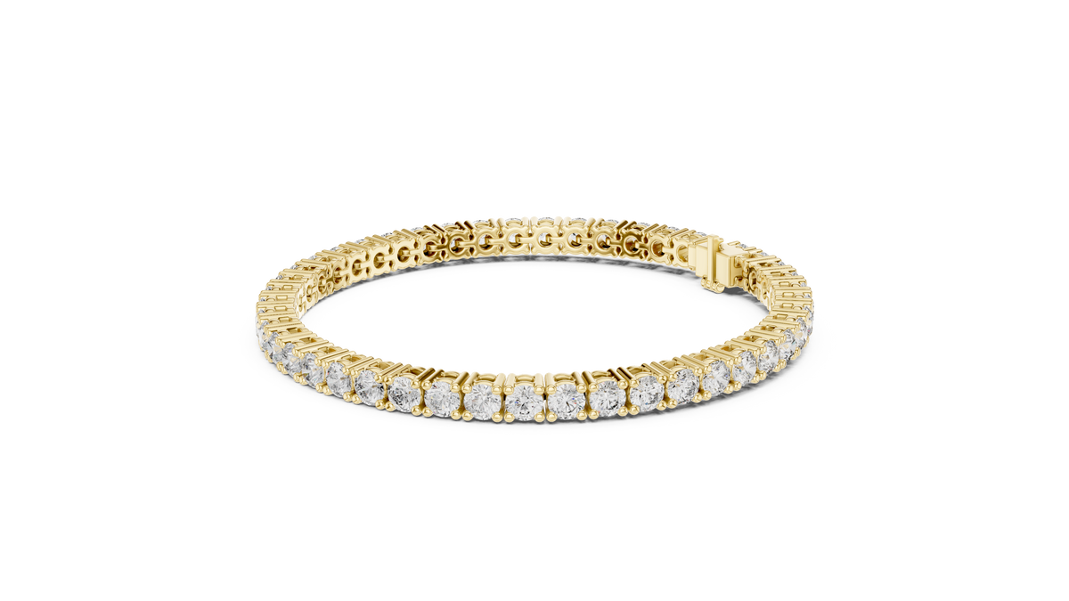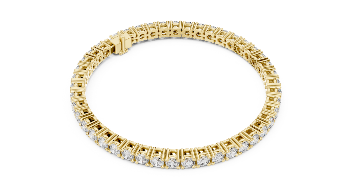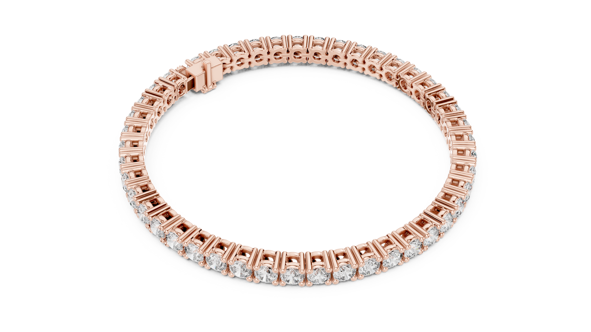 This elegant tennis bracelet showcases a continuous line of perfectly matched round cut diamonds arranged in a refined linear silhouette. Each stone is secured in a classic collet setting, creating a smooth, symmetrical flow that wraps gracefully around the wrist. The uniform spacing and polished finish enhance light reflection from every angle, delivering exceptional brilliance and a timeless, luxurious presence.