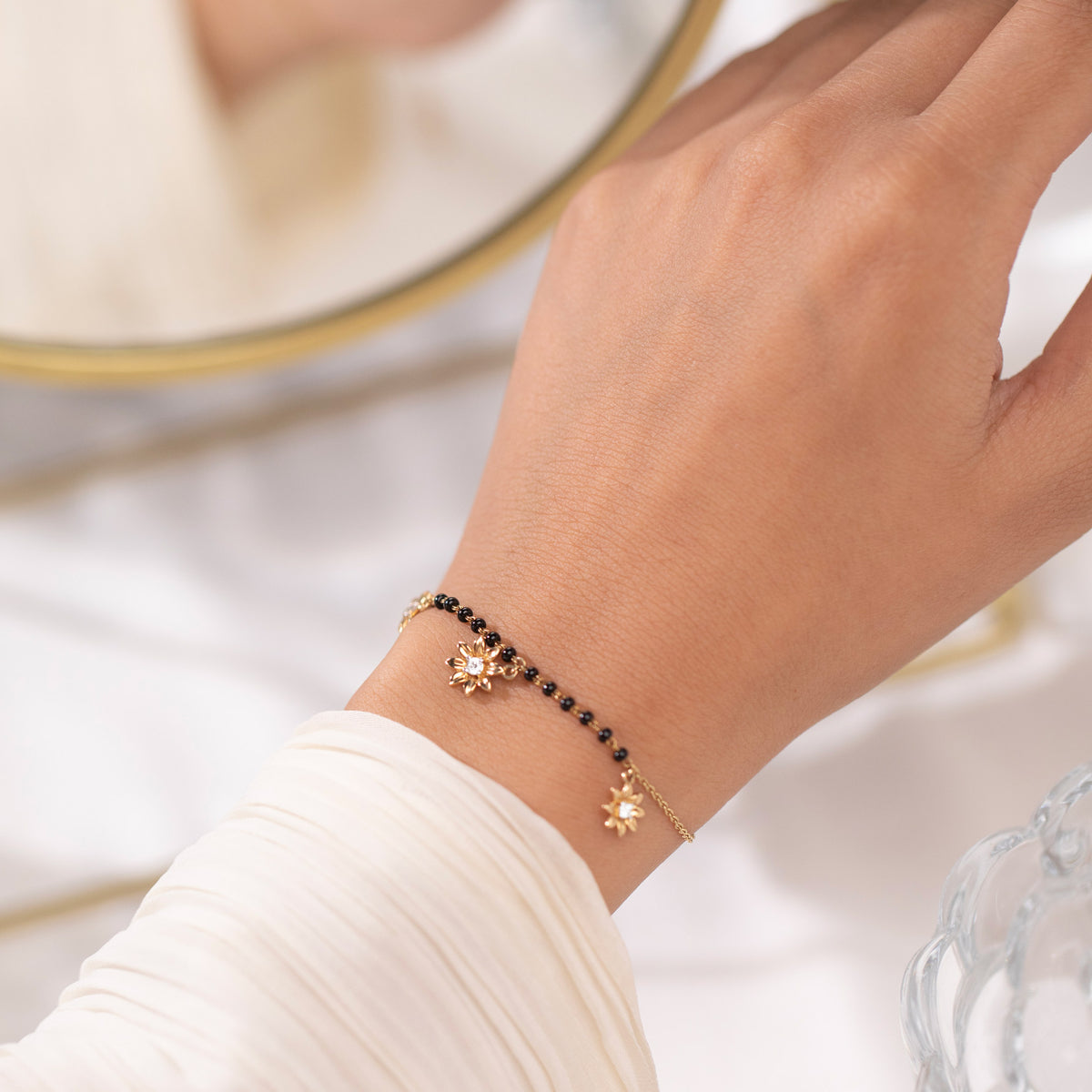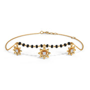 CzedJewels Vanya Diamond Mangalsutra Bracelet is a contemporary reinterpretation of a traditional symbol of marital fidelity. Crafted with precision in yellow gold, this bracelet elegantly combines black beads, synonymous with the mangalsutra, and the brilliance of diamonds to create a piece that balances tradition with modern design. Its subtle yet striking appearance makes it suitable for everyday wear, offering a modern way for women to honor their marital vows while embracing their personal style and sophistication.