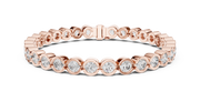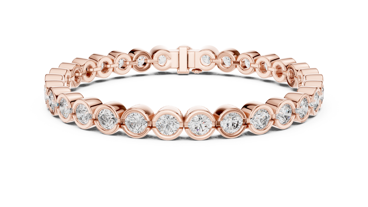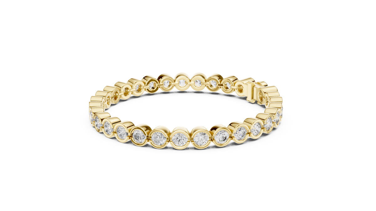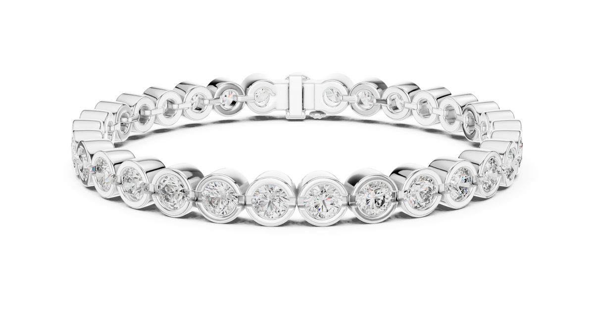 This elegant diamond bangle bracelet showcases a seamless row of round brilliant cut diamonds set in a refined bezel setting. Designed in a classic eternity style, each diamond is individually framed for a smooth, fluid silhouette that wraps gracefully around the wrist. The clean circular settings enhance the brilliance of every stone while offering a modern yet timeless aesthetic.