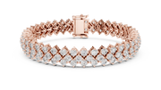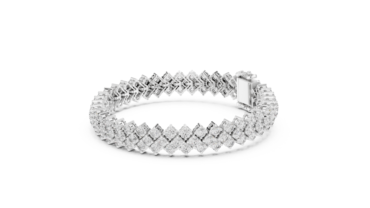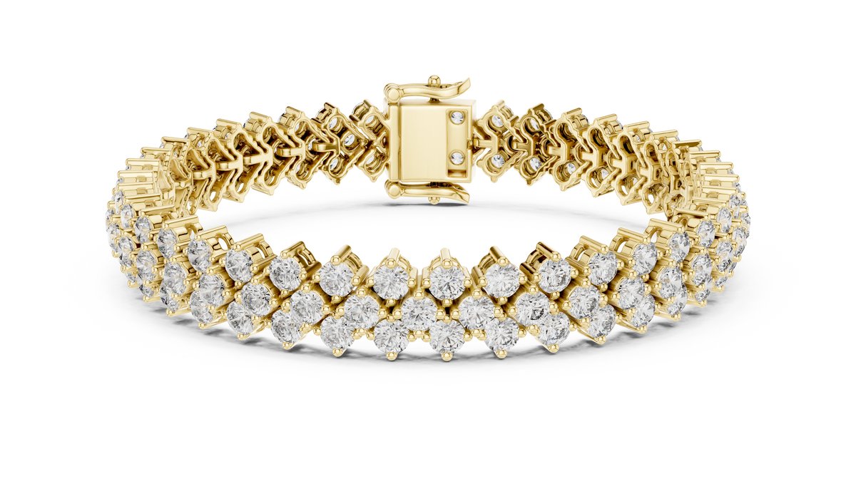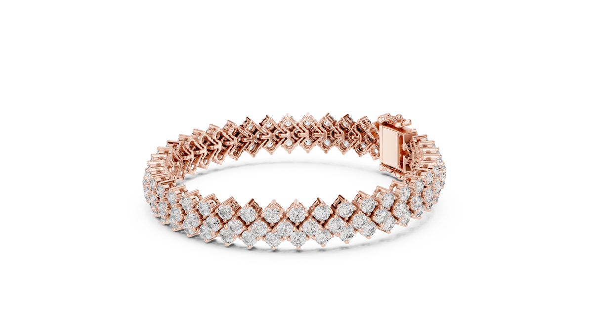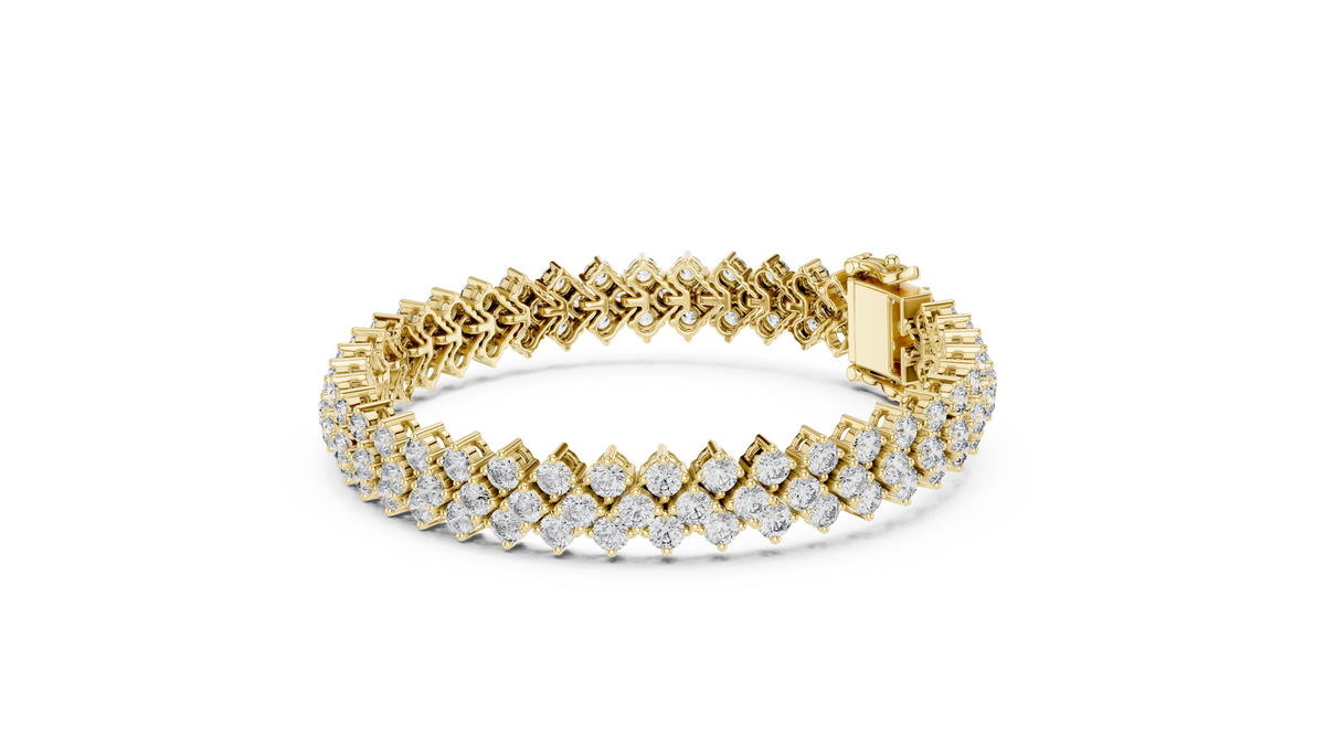 This luxurious tennis chain bracelet features a striking double row of round brilliant diamonds, meticulously aligned to create a continuous flow of sparkle. The flexible interlocking link design ensures graceful movement and a comfortable fit, while the refined collet setting enhances brilliance from every angle. Symmetry, depth, and high polish define this elegant bracelet.