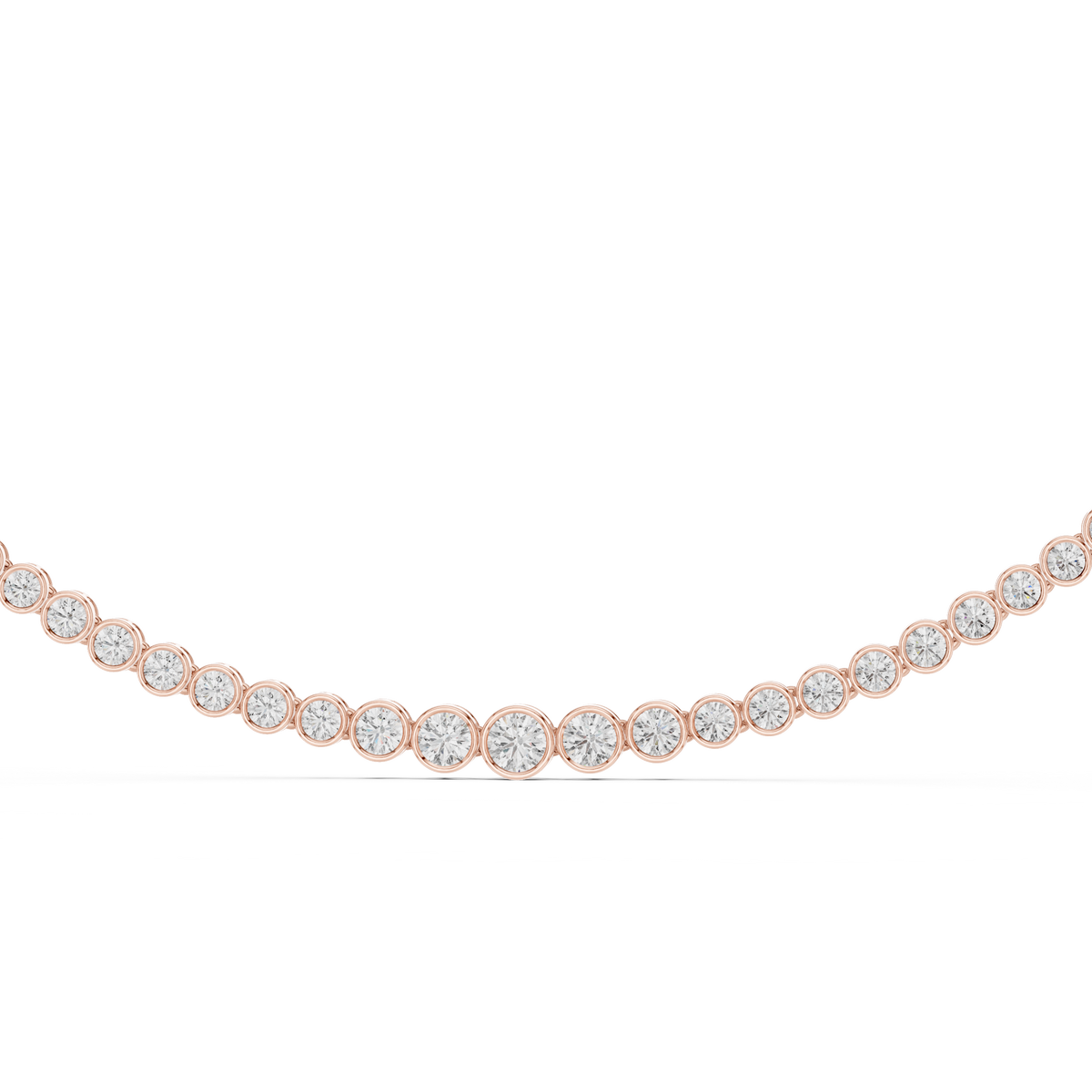 This elegant riviera chain necklace features a continuous sequence of round brilliant diamonds, each framed in smooth bezel settings that create a refined and contemporary silhouette. The diamonds graduate subtly in size toward the center, enhancing visual depth and drawing the eye to the neckline with balanced symmetry. The clean metal borders and uninterrupted sparkle deliver a modern polish while preserving timeless sophistication.