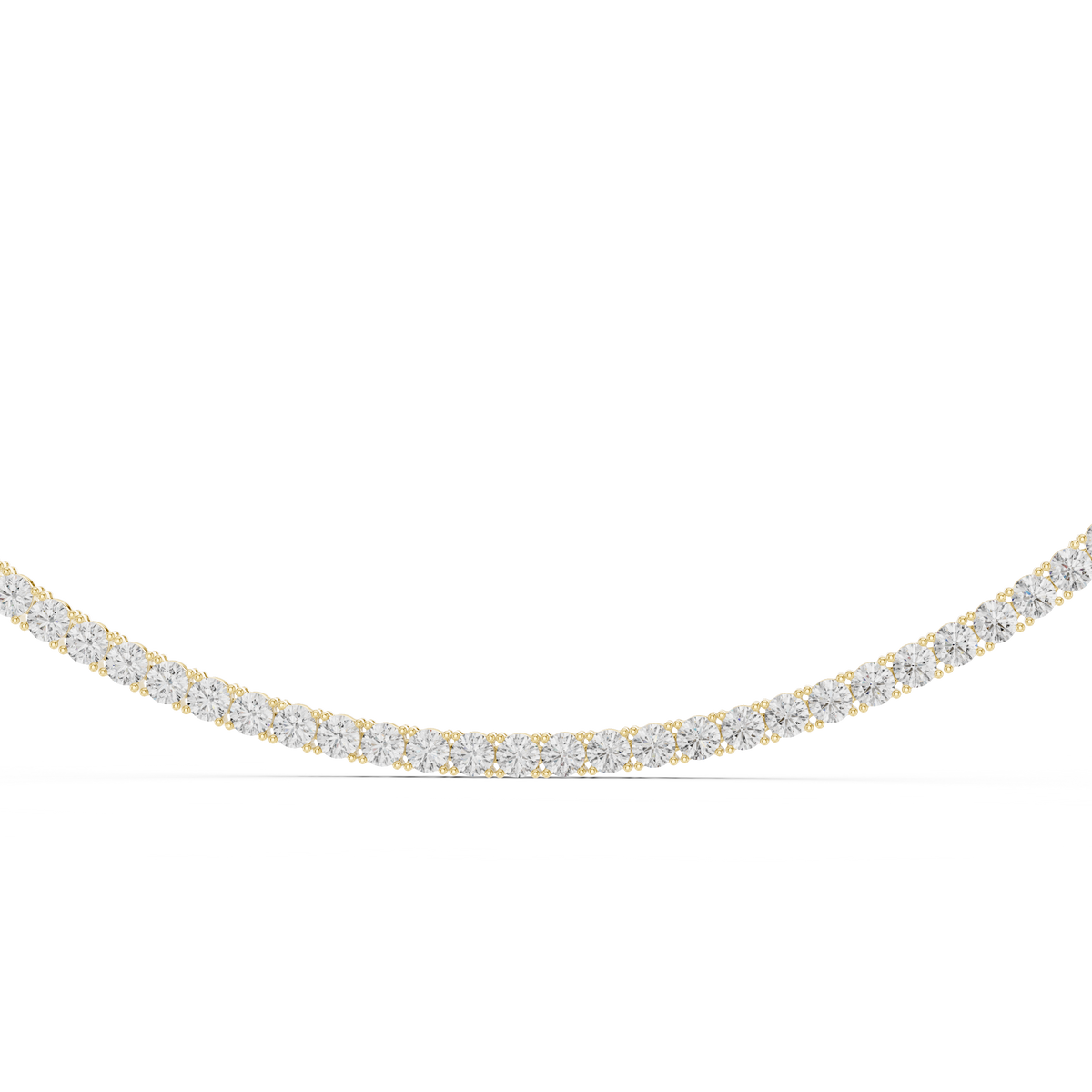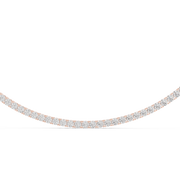 This timeless riviera tennis necklace showcases a seamless line of round brilliant diamonds arranged in perfect symmetry to create uninterrupted sparkle around the neckline. Each stone is evenly matched and precisely set, forming a fluid silhouette that reflects light from every angle. The continuous diamond design offers exceptional brilliance and polish, delivering a refined yet bold presence that embodies classic luxury.