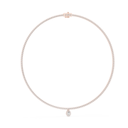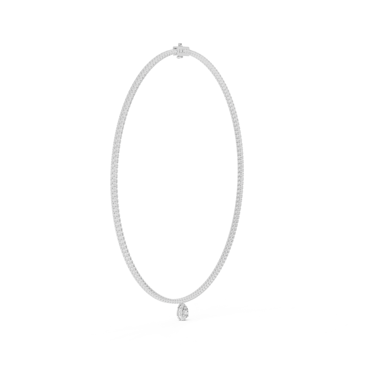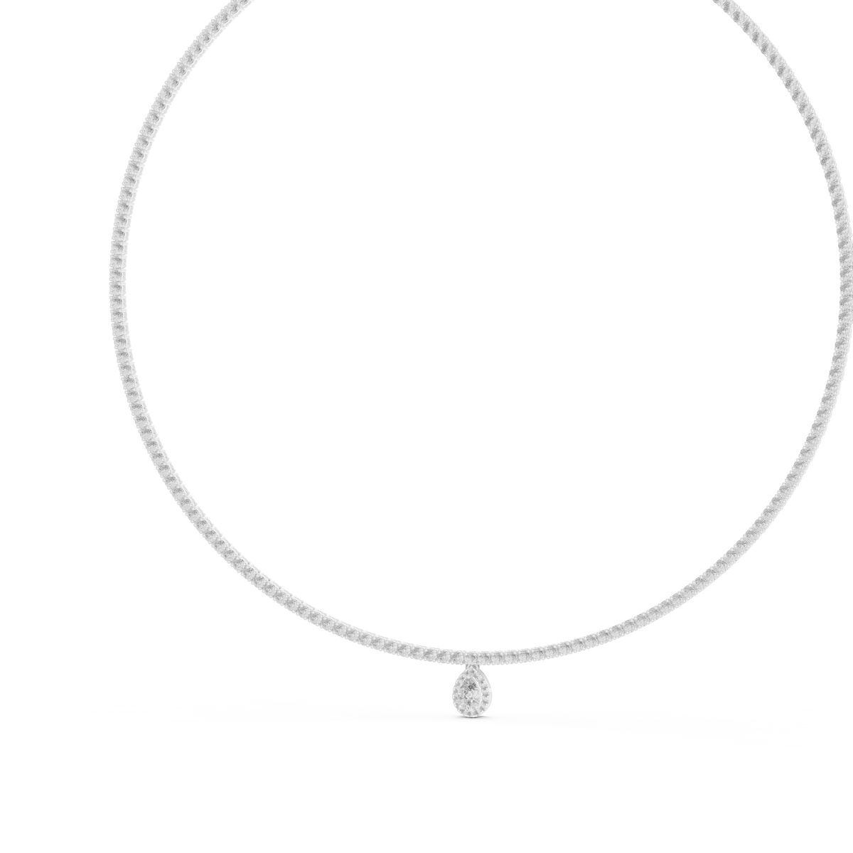 This refined riviera chain necklace showcases a continuous line of round brilliant diamonds that encircle the neckline with delicate, fluid sparkle. The sleek silhouette is elevated by a graceful pear-shaped drop pendant at the center, adding soft movement and a focal point of brilliance. Designed with balanced symmetry and a polished finish, the necklace offers understated luxury with a timeless, elegant presence.