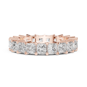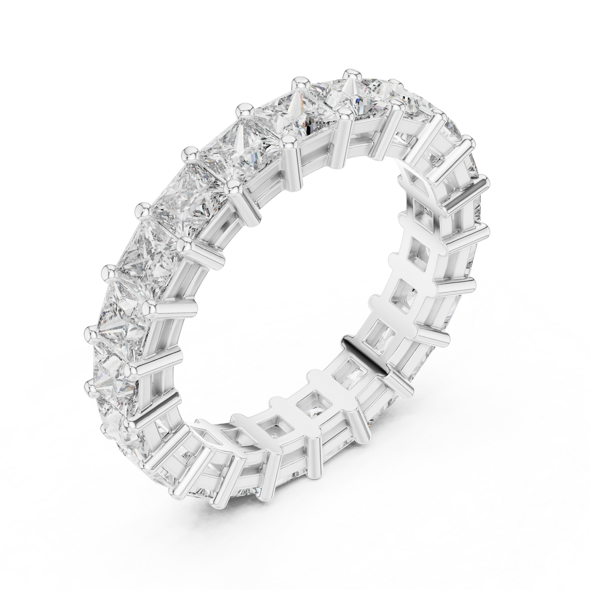 This exquisite eternity band showcases a continuous circle of princess cut diamonds, precisely aligned to create a seamless line of brilliance. Each diamond is expertly secured in a classic shared prong setting, allowing maximum light exposure for exceptional fire and sparkle. The symmetrical full-eternity design ensures balanced radiance from every angle, delivering remarkable depth and brilliance across the entire band.