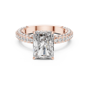 This sophisticated diamond ring features a striking radiant cut solitaire diamond at its center, known for its crisp faceting and balanced brilliance. The structured band is accented with pave-set round diamonds along the shoulders, creating visual depth while maintaining a clean, symmetrical profile.