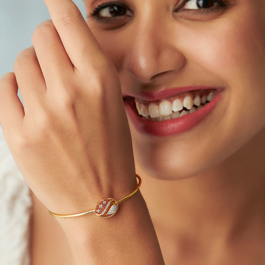 The Makena Paisley Diamond Bracelet showcases a classic paisley design, reimagined with a modern twist. This elegant piece, set in yellow gold, is adorned with radiant diamonds, creating a perfect blend of traditional charm and contemporary elegance. Ideal for those who appreciate intricate designs with a touch of sparkle, this bracelet is a versatile addition to any jewellery collection.
