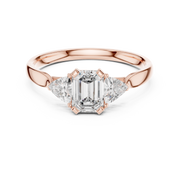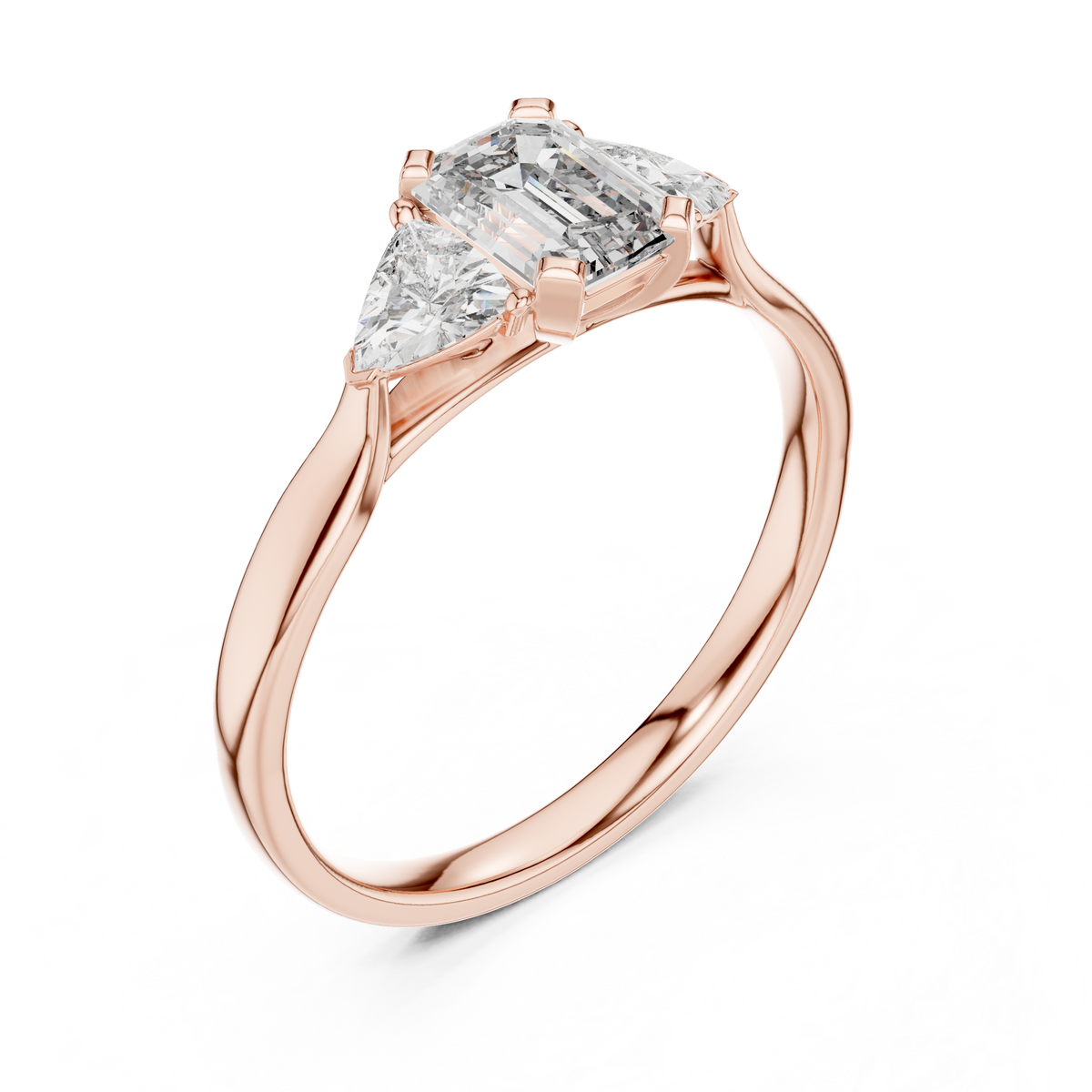 - Diamond shape & cut: Emerald cut center diamond with trillion cut side diamonds