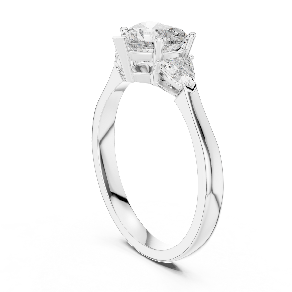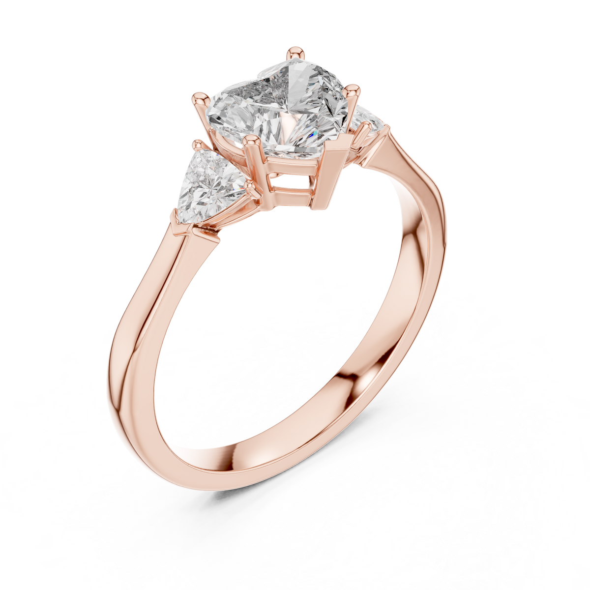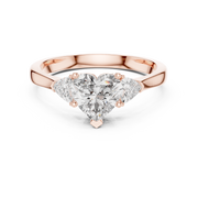This elegant three stone ring showcases a romantic heart cut diamond at its center, beautifully framed by two precisely matched trillion cut side diamonds. The symmetrical layout creates visual balance, while the open collet setting enhances depth, brilliance, and light reflection from every angle.