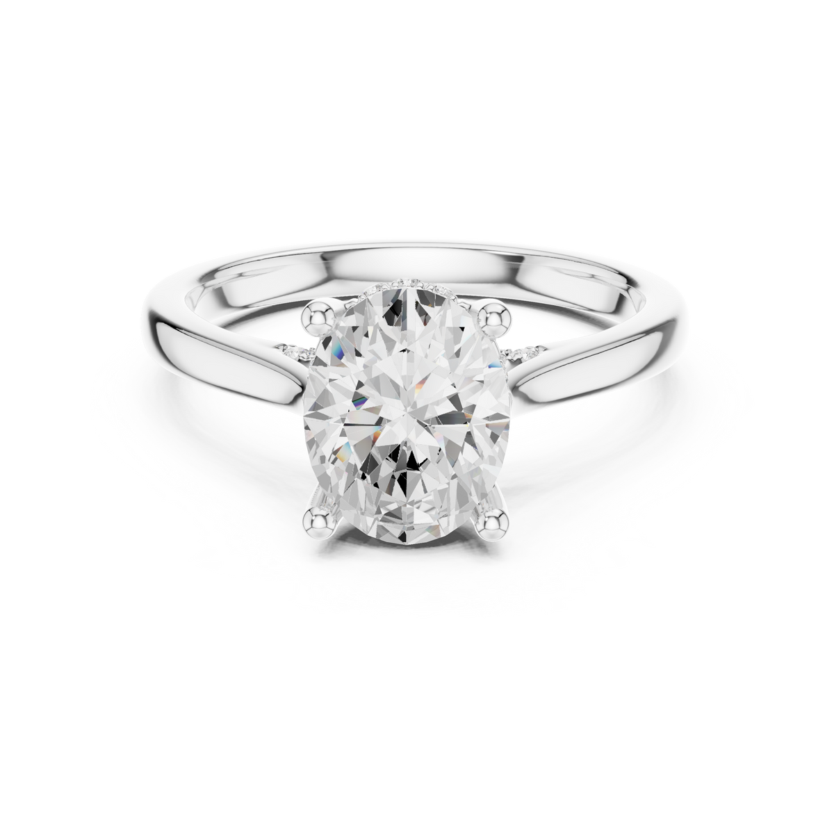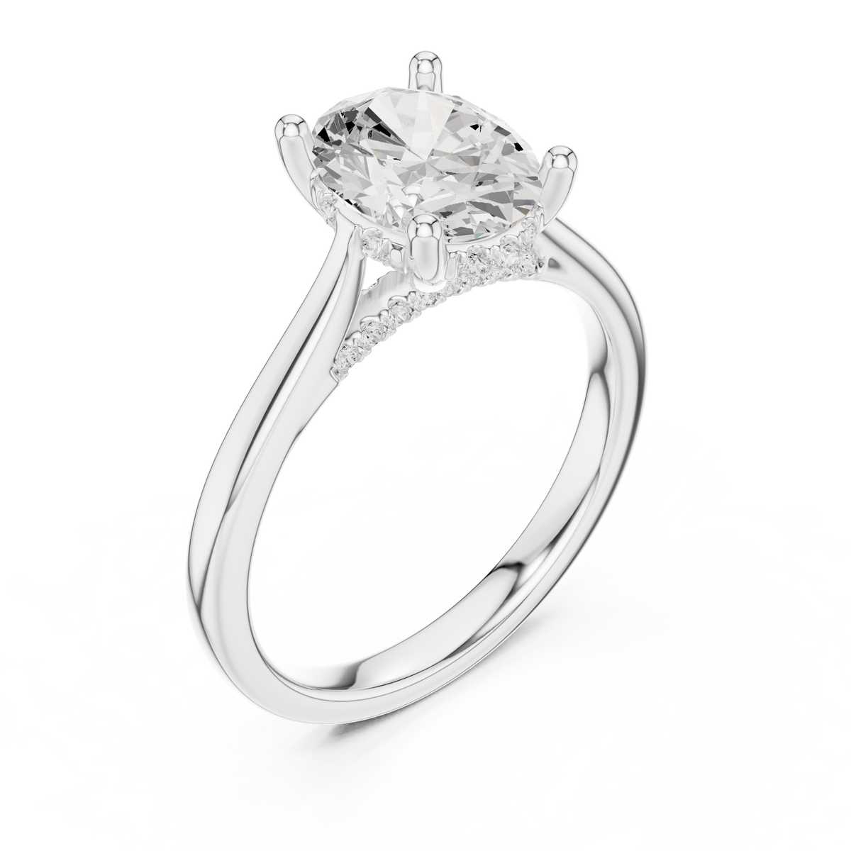 This elegant diamond ring showcases a refined oval cut center diamond in a timeless solitaire setting. The elongated oval shape enhances brilliance while creating a graceful and balanced silhouette on the finger. Hidden beneath the center stone, a row of delicate round diamonds adds subtle sparkle and visual depth, elevating the classic solitaire design with a modern touch.