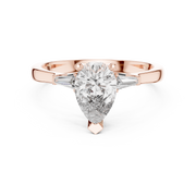 - Diamond shape & cut: Pear cut center diamond with baguette cut side diamonds