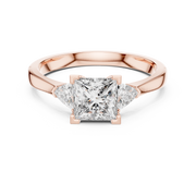 This elegant three stone diamond ring showcases a striking princess cut center diamond framed by two perfectly matched trillion cut side stones. The geometric symmetry creates strong visual balance, while the open collet setting enhances depth and allows light to flow freely through each stone, delivering exceptional brilliance and clarity.