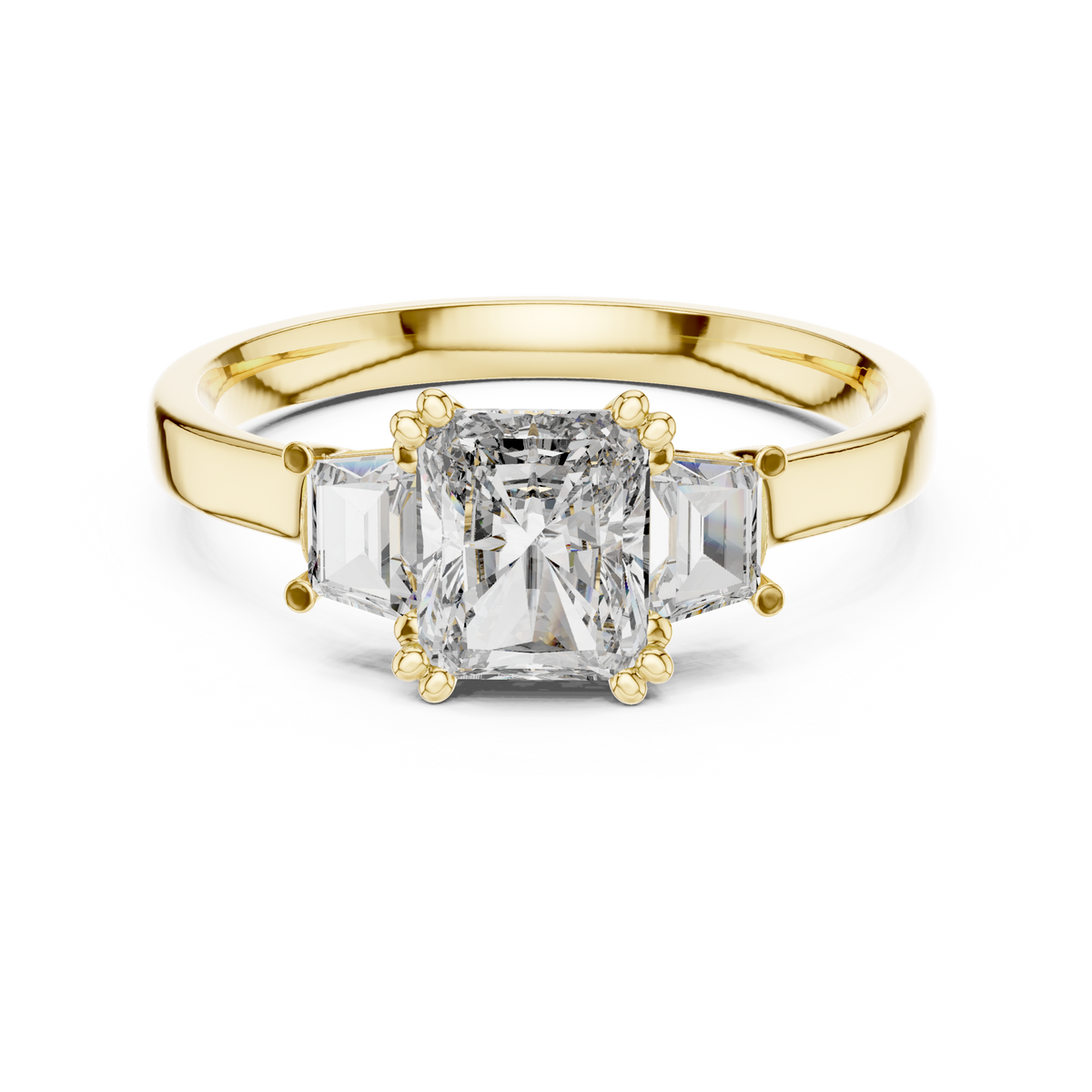 - Diamond shape & cut: Radiant cut center diamond with baguette-cut side diamonds