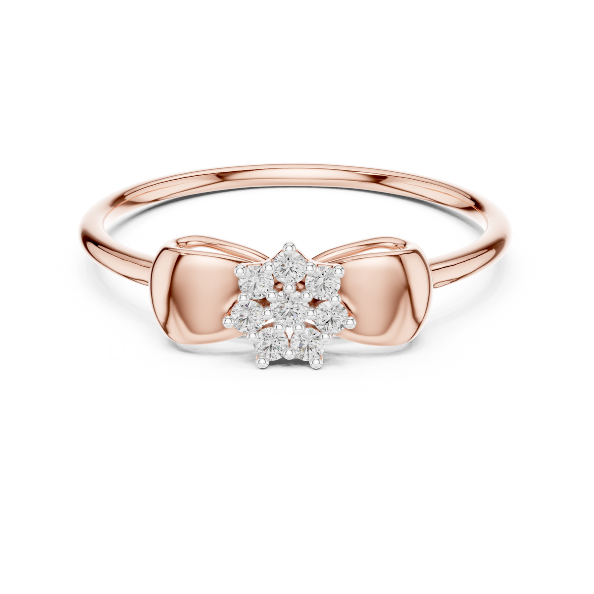 This elegant diamond ring features a refined bow-inspired silhouette centered with a sparkling cluster of round cut diamonds. The symmetrical design highlights a compact floral-style cluster that creates visual depth and concentrated brilliance. Smooth, polished shoulders frame the centerpiece, allowing light to reflect evenly across the diamonds for a balanced and graceful appearance.