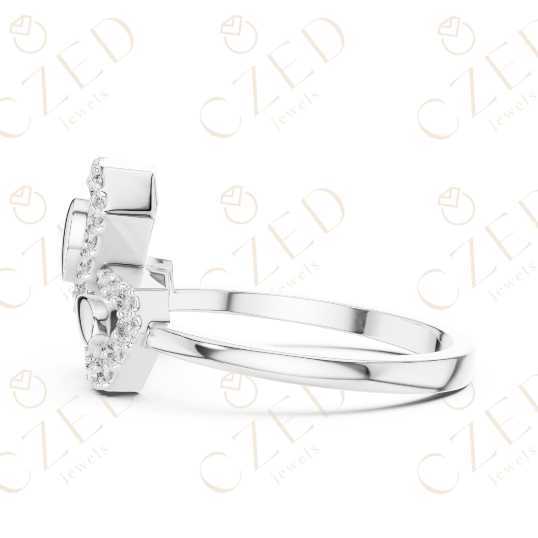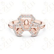 This elegant fashion ring showcases a graceful butterfly-inspired silhouette crafted with precisely set round cut diamonds. The symmetrical openwork design is framed by a shimmering halo of pavé diamonds, creating visual depth, refined sparkle, and a light, airy presence on the finger.