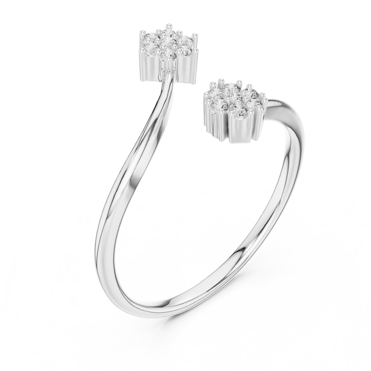 This elegant open ring showcases a graceful twist band design, highlighted by two floral diamond clusters positioned at each open end. Crafted with round cut diamonds, the design creates balanced symmetry, visual depth, and a soft brilliance that feels both modern and timeless.