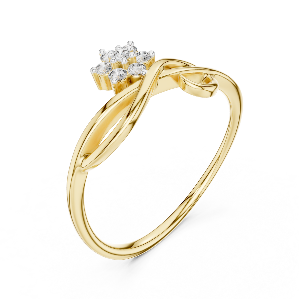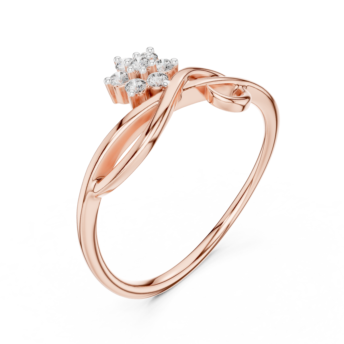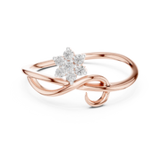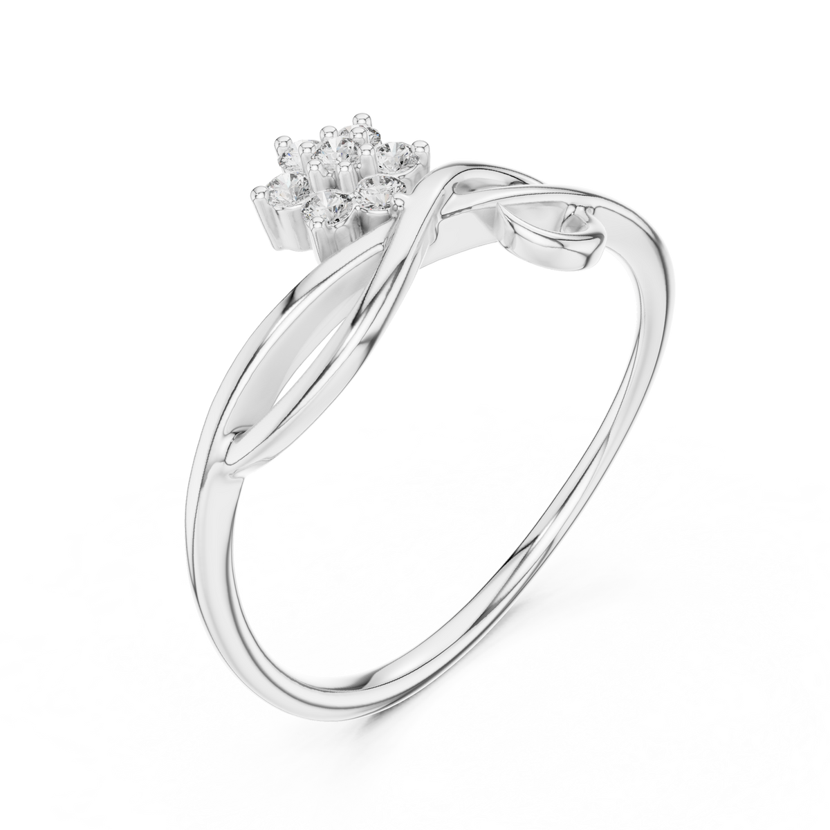 This refined diamond ring features a graceful twist bypass design highlighted by a floral cluster of round cut diamonds. The flowing curves of the band create elegant symmetry, while the elevated floral arrangement adds depth, brilliance, and a delicate sense of movement.