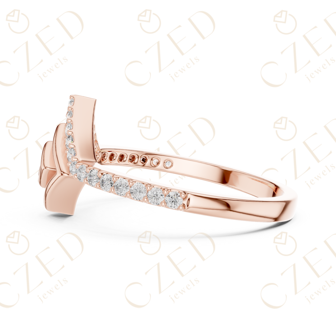 This modern diamond ring features a striking geometric chevron design with a sculptural open center. Round cut diamonds are precisely set along the angled contours, creating sharp symmetry, dimensional depth, and radiant brilliance. The clean architectural lines deliver a bold yet refined visual balance.