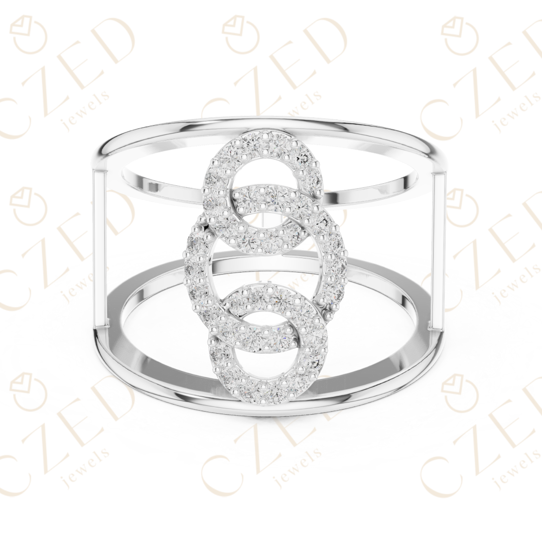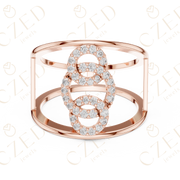 This refined diamond ring features an elegant interlocking infinity design adorned with round brilliant cut diamonds. The open, symmetrical structure creates visual depth and fluid movement, while precisely prong-set diamonds deliver continuous sparkle and a sophisticated, modern silhouette.