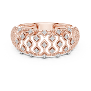 This striking diamond band ring showcases an intricate lattice-inspired design adorned with round cut diamonds. The openwork structure creates rhythmic symmetry across the wide band, while evenly spaced diamonds add visual depth and consistent brilliance. A refined collet-style setting enhances light reflection, giving the ring a bold yet elegant presence.