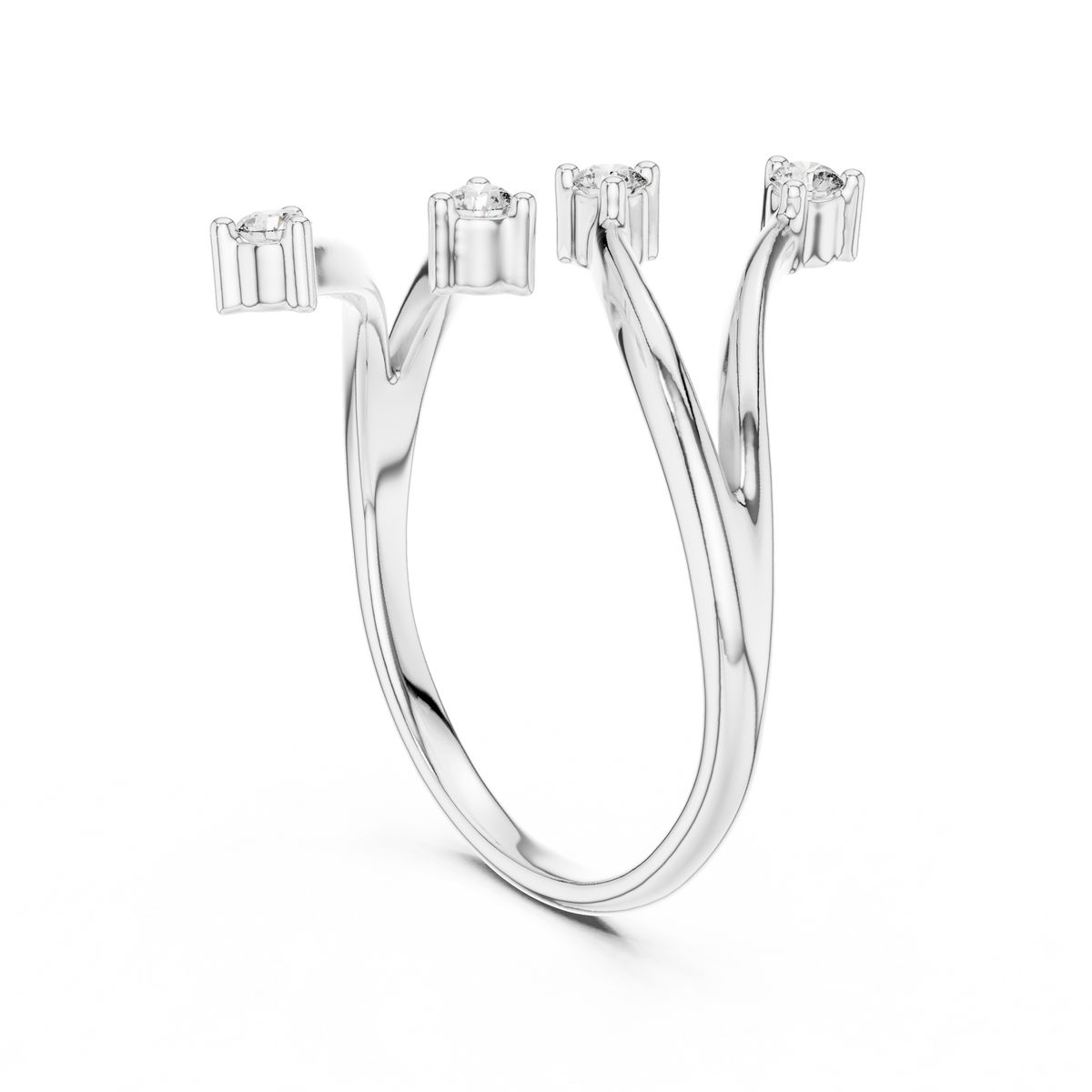 This refined open ring features a sculptural twist band design adorned with multiple round cut diamonds. Each diamond is individually set to create visual rhythm, balanced symmetry, and elegant spacing. The flowing curves and open structure enhance depth, allowing light to interact beautifully with every stone.