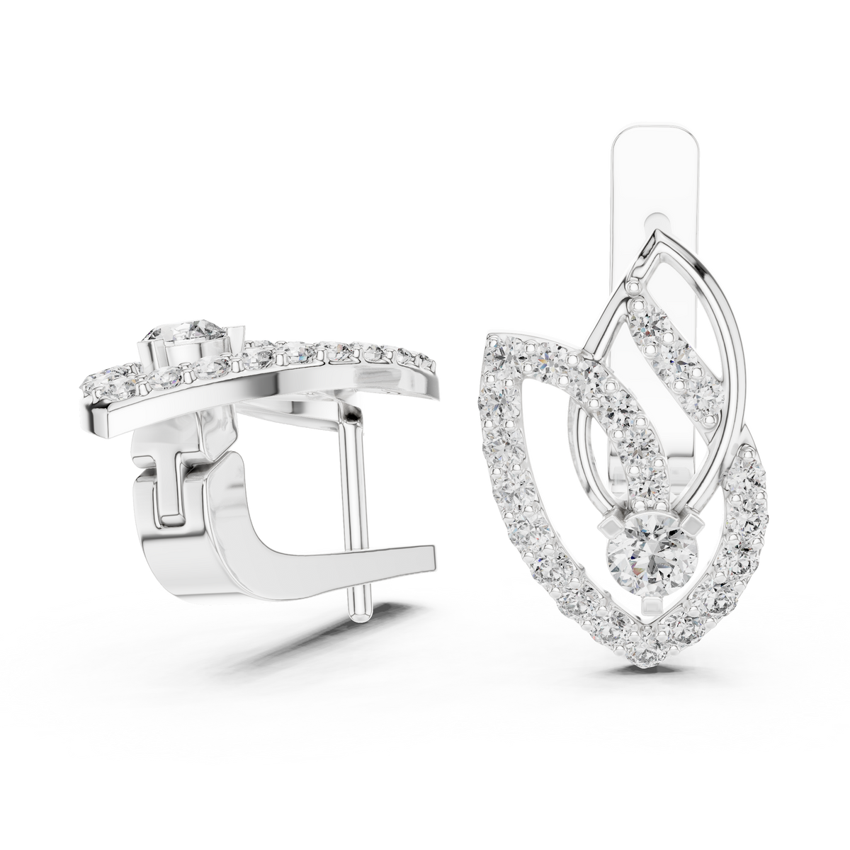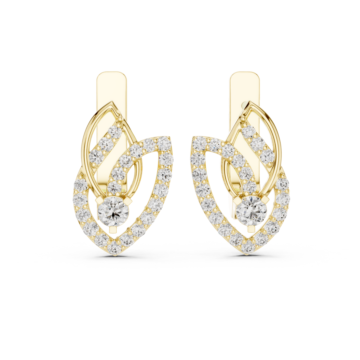 These elegant drop earrings feature a refined layered teardrop silhouette adorned with brilliant round cut diamonds. A central round diamond is framed by pavé-set accents and elevated inner curves, creating depth, light reflection, and graceful movement. The openwork design enhances brilliance while maintaining a delicate, airy profile for a sophisticated yet modern finish.
