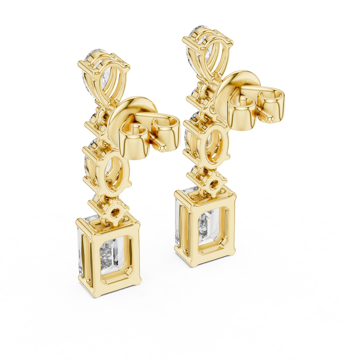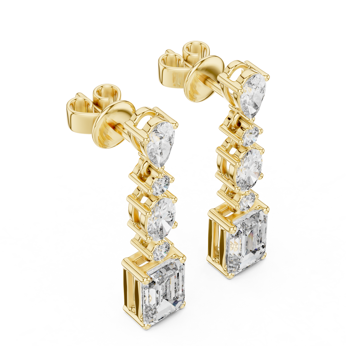 These refined drop earrings showcase a graceful vertical design adorned with a harmonious sequence of pear, round, oval, and emerald-cut diamonds. Each stone is individually set to create fluid movement, balanced symmetry, and striking visual depth. The cascading structure enhances brilliance from every angle, offering a polished and elegant presence.