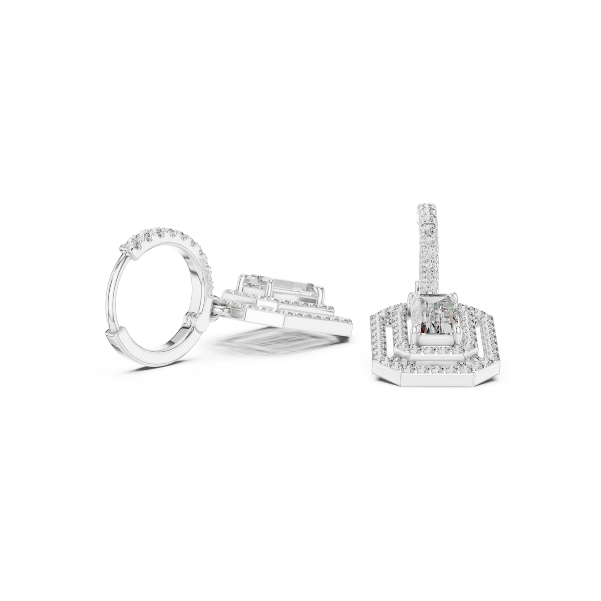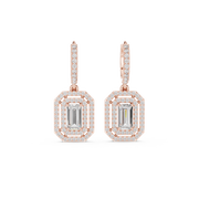 At the center of each drop sits an elongated emerald cut stone, framed by a double halo of round diamonds. The layered halo enhances depth and light reflection, delivering amplified sparkle and a striking presence from every angle.