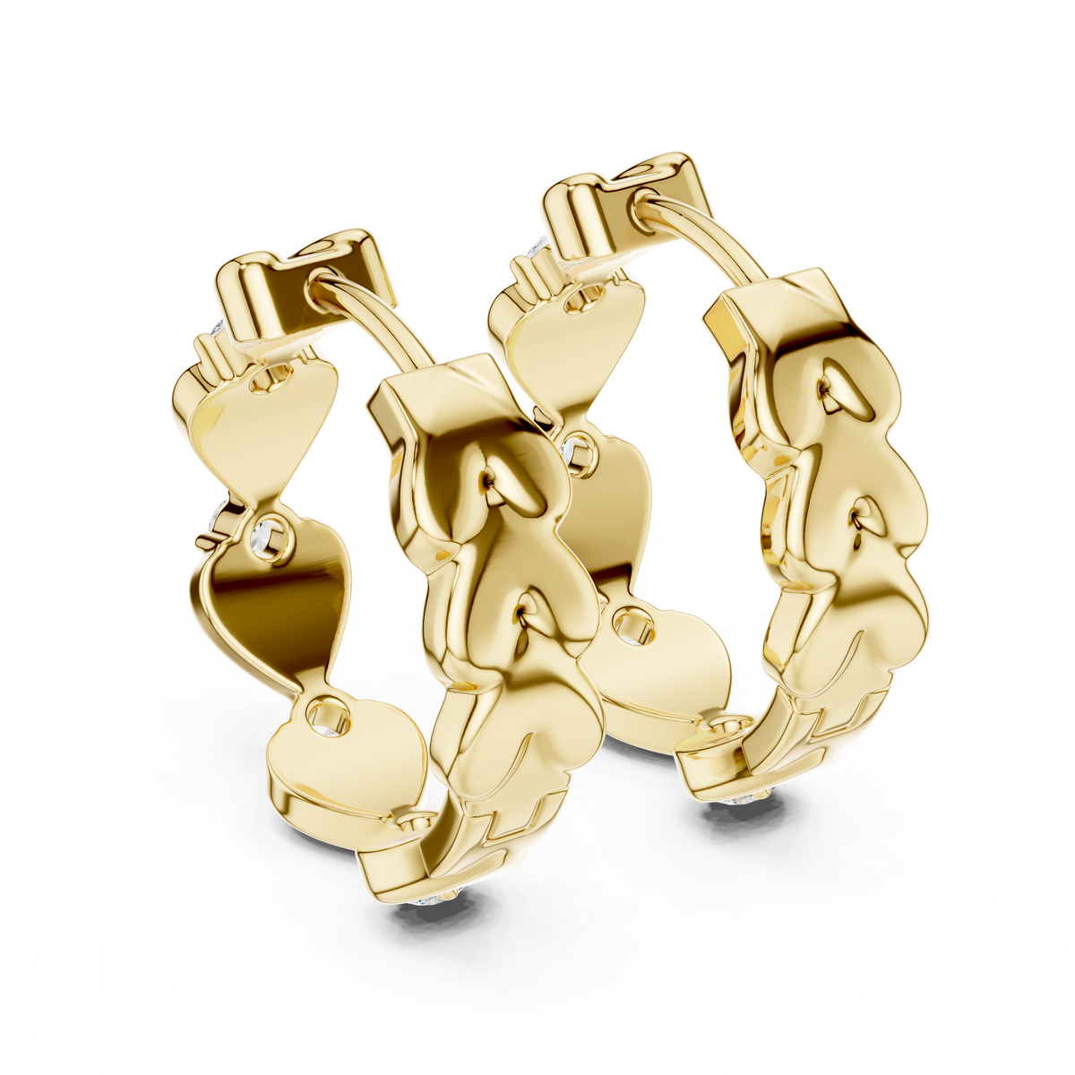 These elegant huggie hoop earrings feature a refined heart motif design accented with round brilliant cut diamonds. The structured hoop form hugs the ear closely, while the repeating heart silhouettes create visual rhythm and depth. Precisely set diamonds add balanced sparkle, resulting in a polished and harmonious design with timeless appeal.