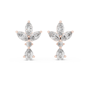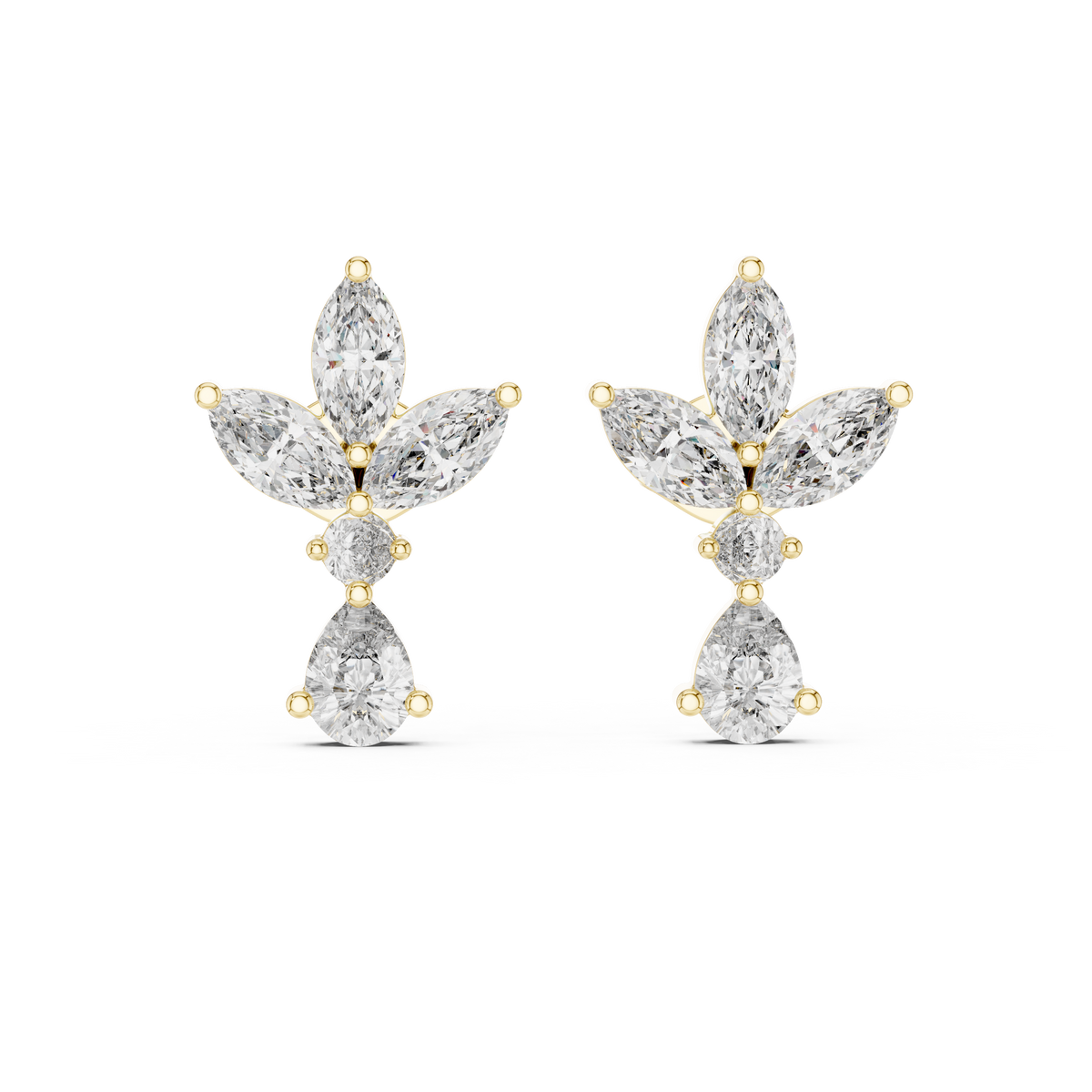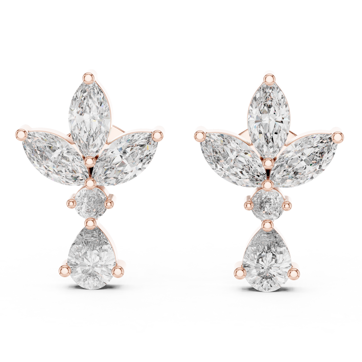 These diamond drop stud earrings showcase a graceful floral-inspired silhouette crafted from a cluster of marquise diamonds that form delicate petal shapes. A round brilliant diamond sits at the center, while a pear cut diamond drop adds soft movement and elegant length below. Designed in a balanced stud-to-drop structure, the composition offers dimensional sparkle, refined symmetry, and eye-catching brilliance from every angle. Prong and collet settings secure each stone while allowing maximum light performance for a luminous finish.