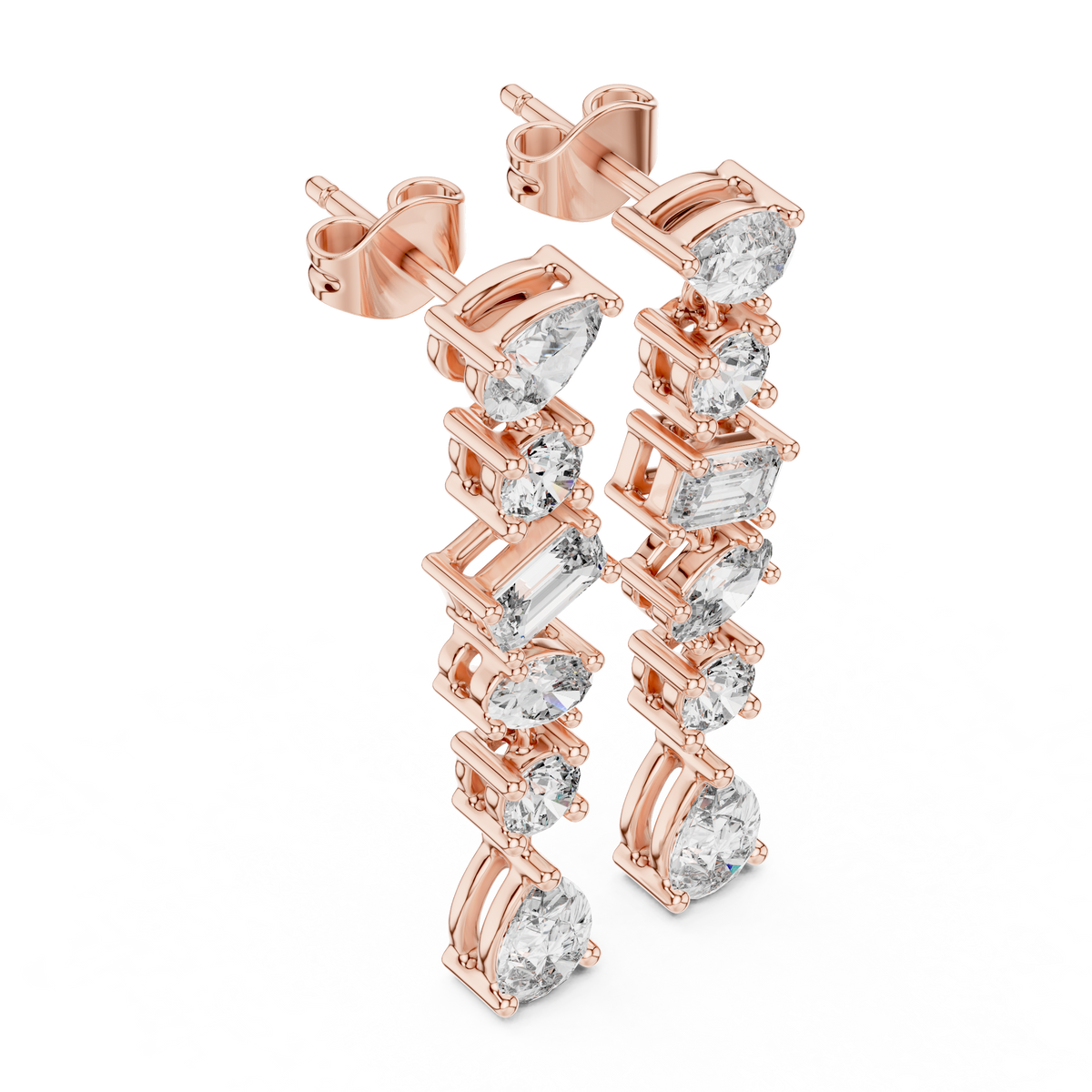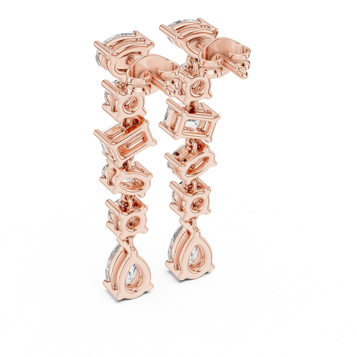 These striking drop earrings showcase a refined vertical arrangement of mixed-cut diamonds, creating graceful length and captivating movement. A sequence of pear, round, emerald, and oval silhouettes is linked in a sleek linear design, allowing each stone to catch the light from every angle. The flowing structure delivers depth, brilliance, and an elegant statement finish perfect for formal occasions.