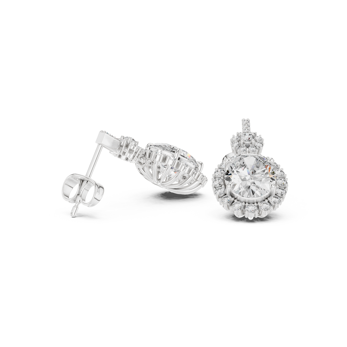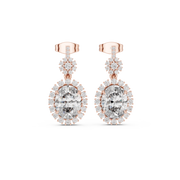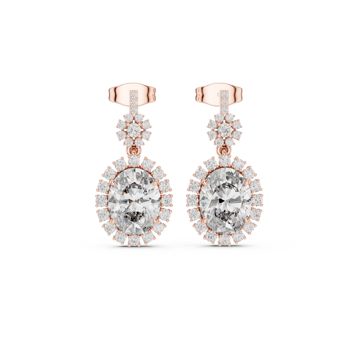 At the center, each earring features a striking oval cut stone surrounded by a halo of round diamonds arranged in a soft floral pattern. This layered cluster enhances brilliance and depth, creating a luminous frame that amplifies light reflection from every angle.