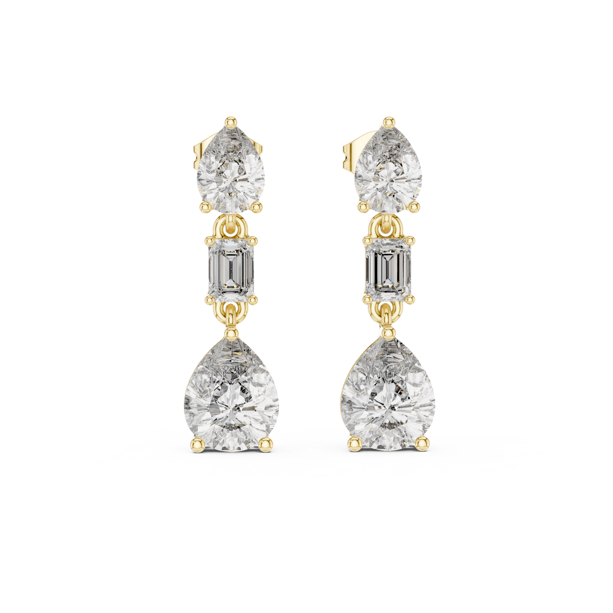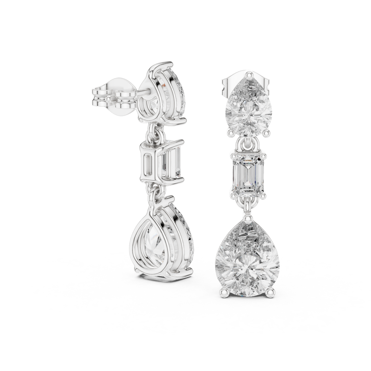 These diamond drop earrings present a sophisticated three-stone composition that flows vertically with graceful movement. A pear cut diamond sits at the top, followed by a sleek emerald cut center stone, and finished with a larger pear cut drop. The linear arrangement creates elegant length, balanced symmetry, and exceptional light reflection, delivering a refined silhouette with eye-catching brilliance.