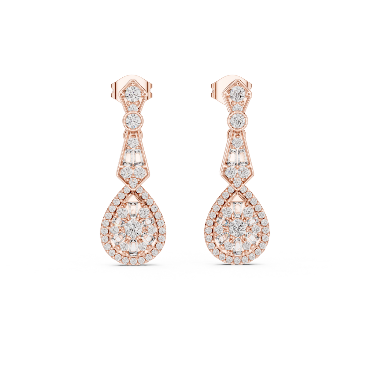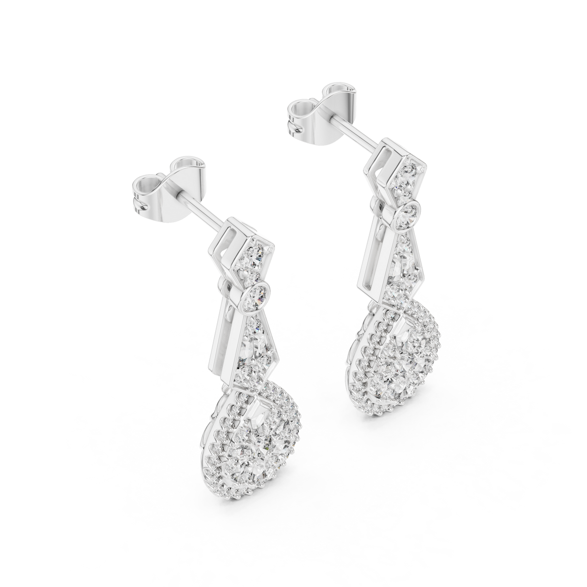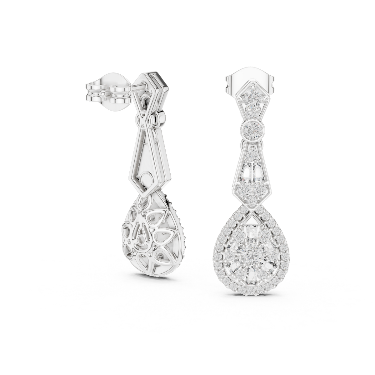 These diamond drop earrings present a refined multi-section silhouette beginning with a classic stud top and flowing into a sculpted geometric link that leads to an ornate teardrop pendant. The lower drop showcases a radiant halo cluster design, combining round and baguette cut diamonds to create depth, dimension, and exceptional brilliance. The articulated structure allows graceful movement, enhancing light play and delivering statement-worthy elegance with every turn.