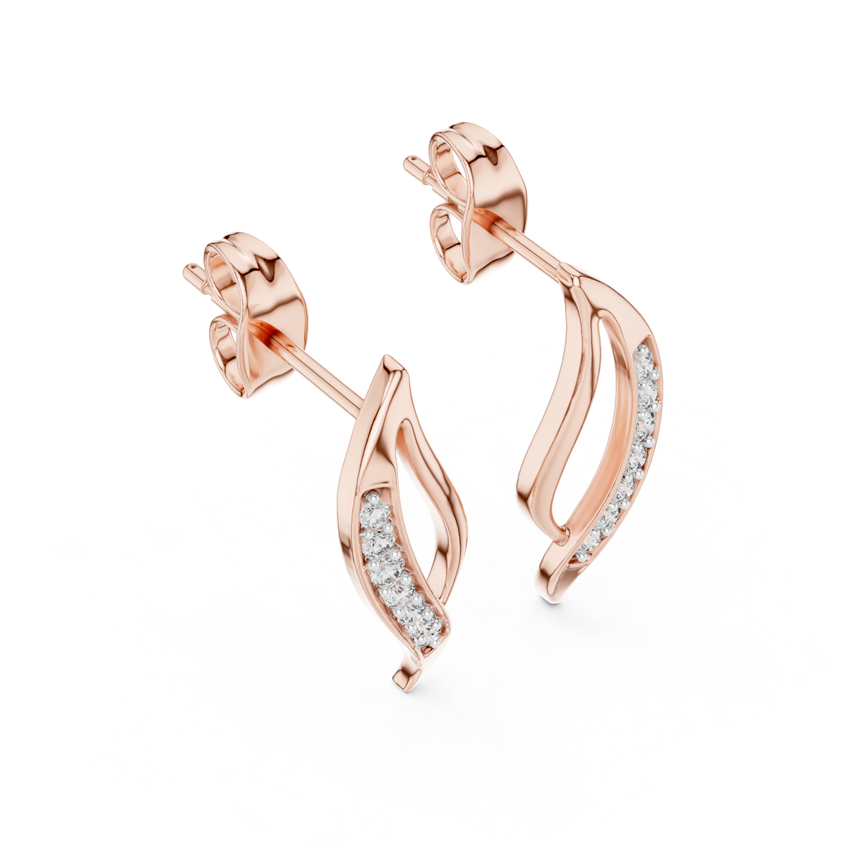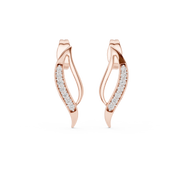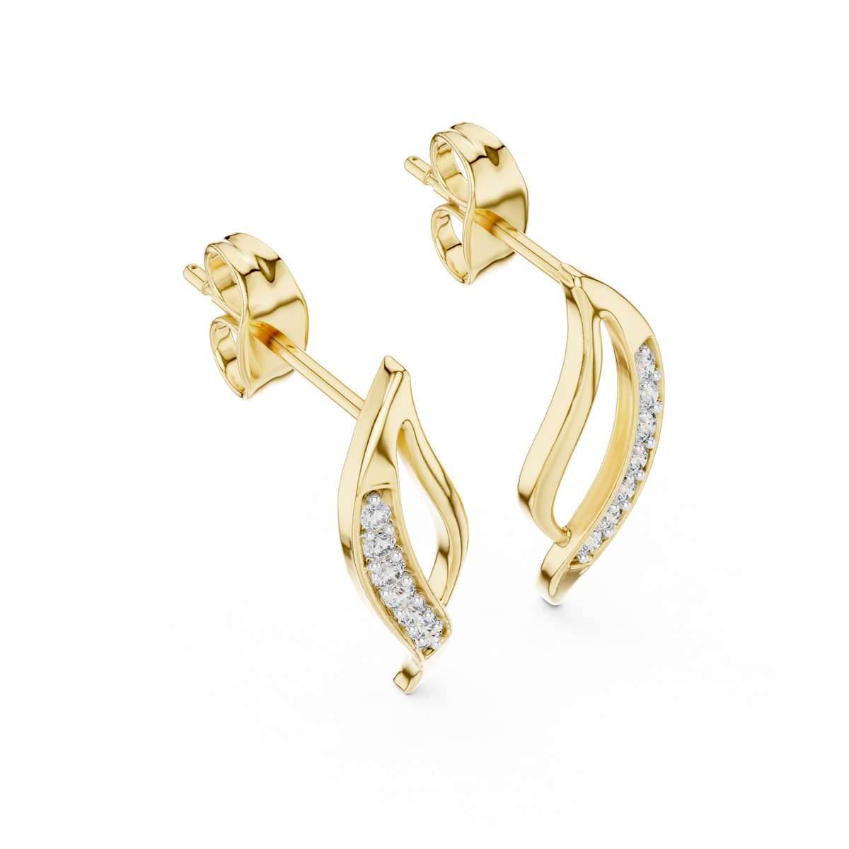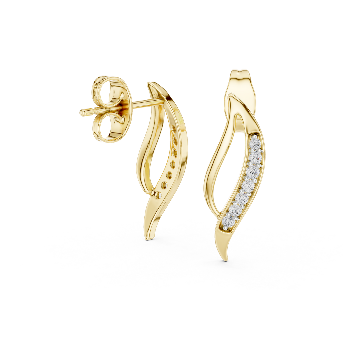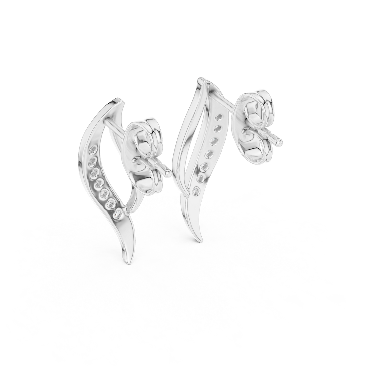These modern drop earrings feature a graceful curved leaf silhouette with a flowing open form that elongates the ear. A row of round cut diamonds lines the inner curve, creating a continuous ribbon of brilliance. The sleek structure, gentle movement, and polished contours offer a refined balance of elegance and contemporary style.