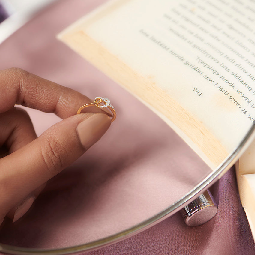 The Silvia Love Knot Diamond Ring by CzedJewels is a symbol of everlasting love. Crafted in 18kt yellow gold, this stunning ring features a unique knot design that intertwines two bands of shimmering diamonds in a prong setting. The love knot design represents the unbreakable bond between two people in love. This ring is perfect for gifting to your significant other or as a symbol of love and commitment for a special occasion like an anniversary or engagement.