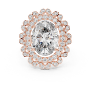 This striking ring features a commanding oval cut sapphire as its centerpiece, surrounded by a luminous double halo of round cut diamonds. The layered halo construction enhances visual depth and symmetry, while the precise setting allows exceptional light reflection for rich brilliance and a bold, elegant presence.