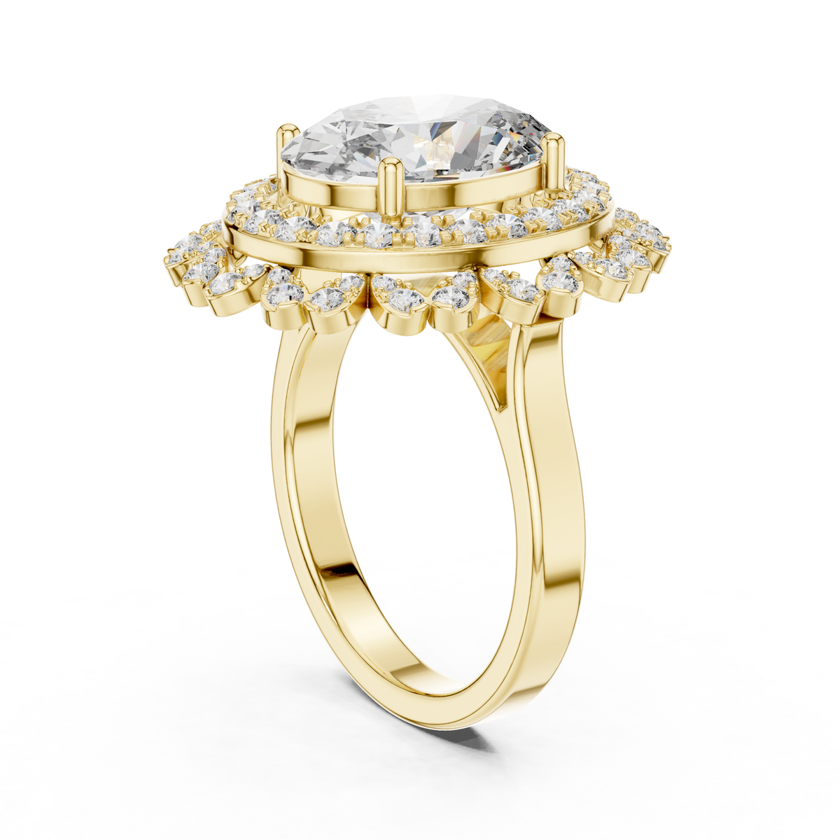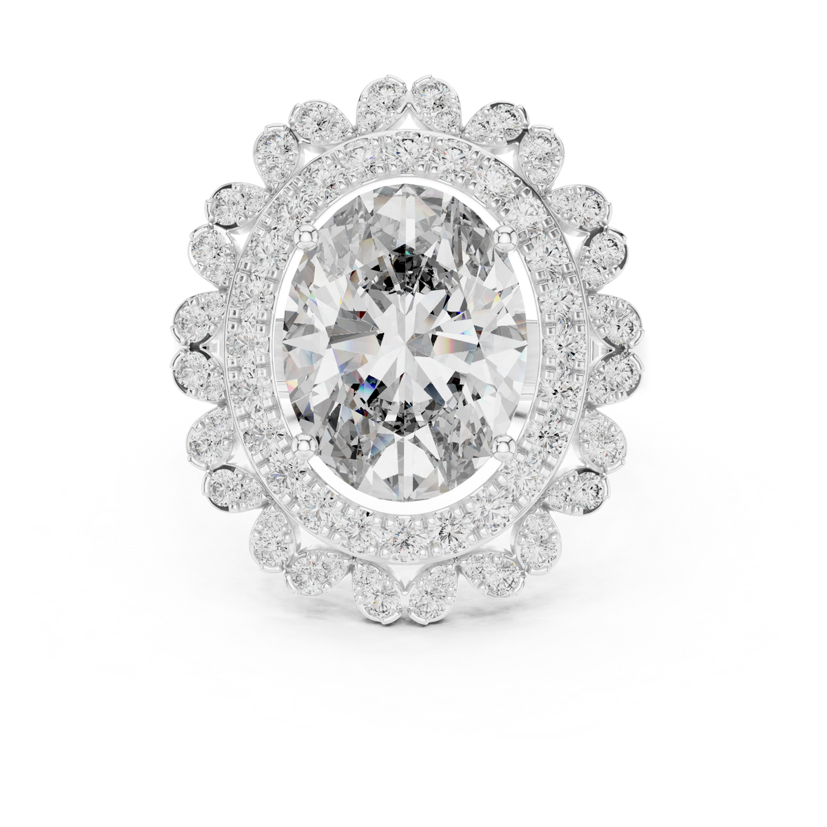 - Side stones: Round cut diamonds arranged in a double halo formation