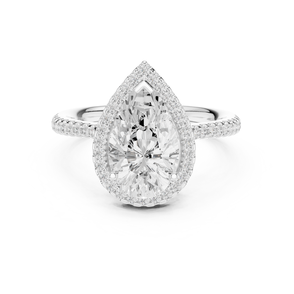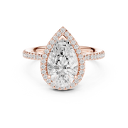 This exquisite engagement ring showcases a captivating pear cut blue gemstone at its center, gracefully framed by a luminous halo of round brilliant diamonds. The elongated pear silhouette enhances finger length while creating a refined and elegant presence. A delicate pavé-set band adds continuous sparkle, complementing the brilliance of the center stone. The balanced symmetry between the halo and band delivers remarkable visual depth and radiant light reflection from every angle.
